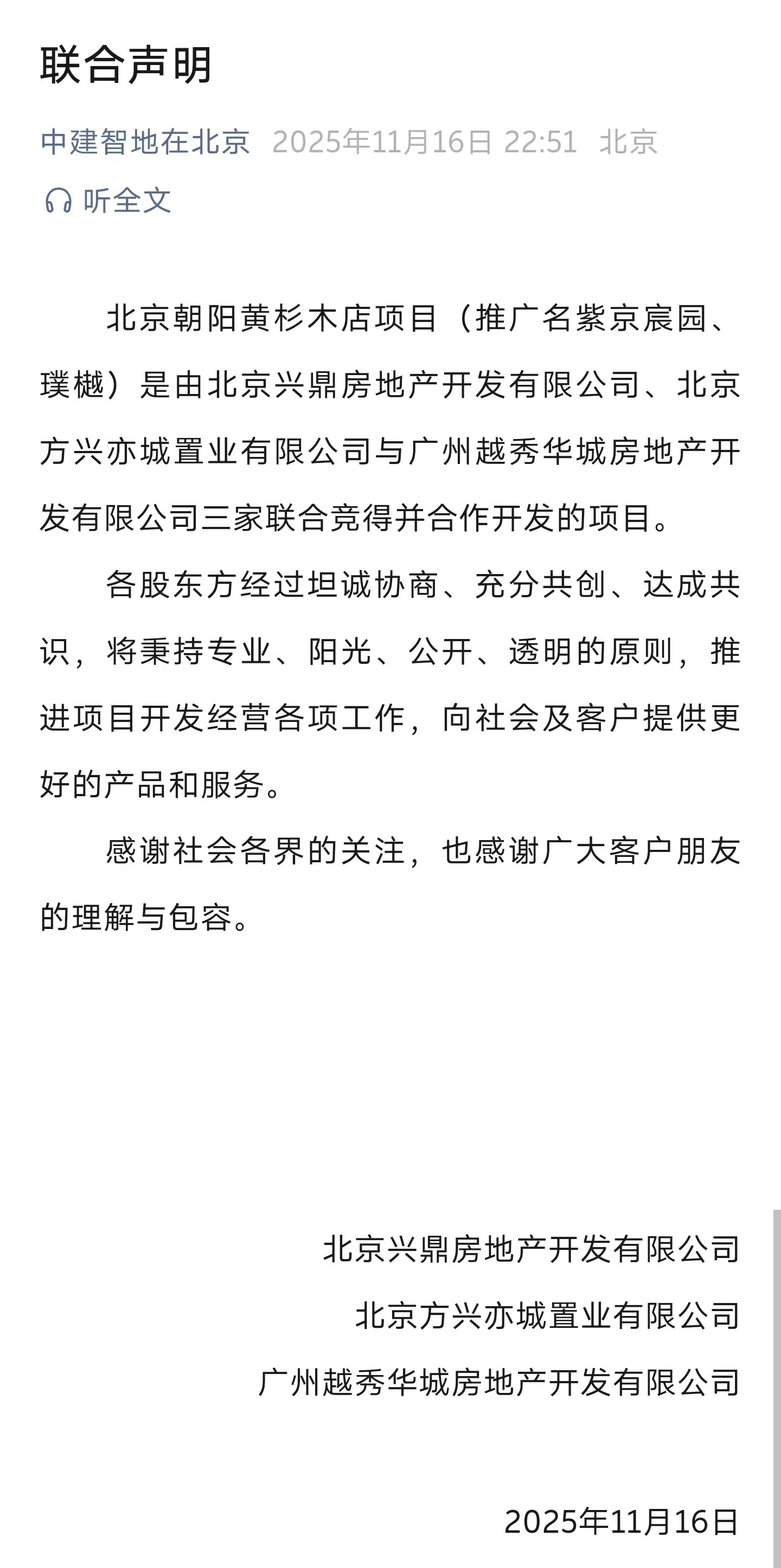 2025年11月16日晚,中建智地、中国金茂、越秀地产,就此前北京朝阳区黄杉木双子座璞樾和紫京宸园纠纷,分别发布了三方联合声明。