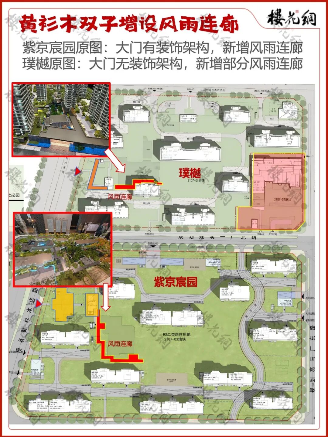 从沙盘上看,两个盘都疑似增设了风雨连廊。只是,在它们的报规图上都没有体现,这也让风雨连廊是否合规,成为一个悬疑点。