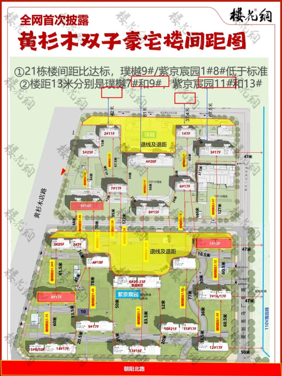 此外,璞樾的7#和9#、紫京宸园的11#和13#,侧前方的楼间距都只有13米左右。