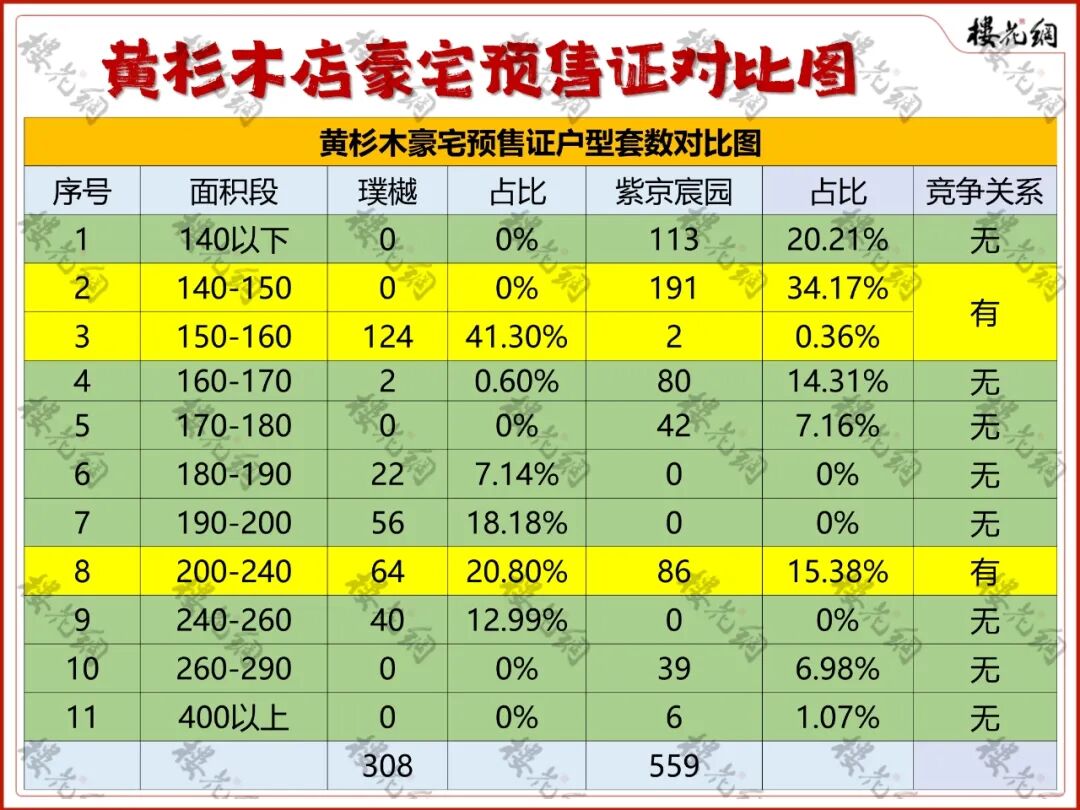 从目前第一批次领取的预售证看,它们存在竞争关系的面积段,主要发生在140-160平米之间。璞樾124套、紫京宸园193套,分别占比41.3%和34.53%。