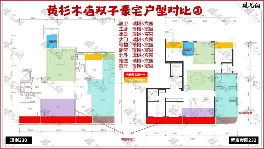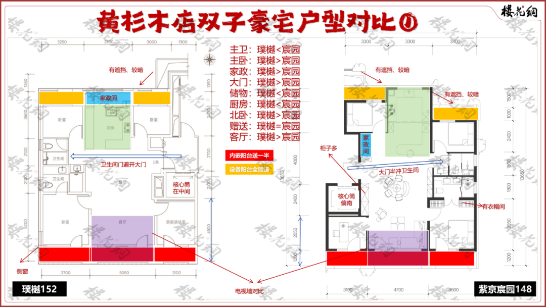 它们都是南向四面宽,璞樾有4房,紫京宸园有5房。