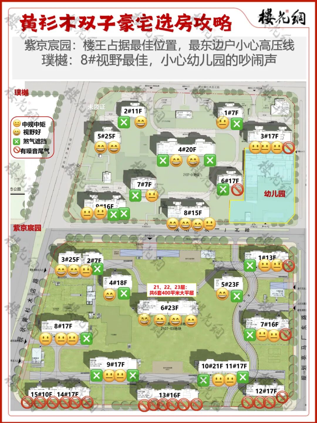 璞樾视野最好的楼栋是3#、8#;紫京宸园则为6#。