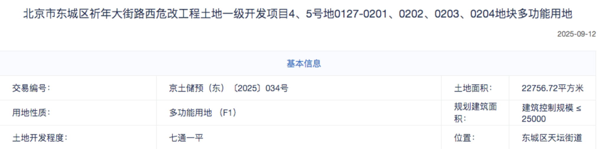 该地块全称为“东城区祈年大街路西危改工程土地一级开发项目4、5号地0127-0201、0202、0203、0204地块”,属多功能用地。作为北京“第七轮拟供应商品住宅用地清单”中动作第二快的项目,原本被市场寄予厚望,预计将成为10月土拍市场的焦点。