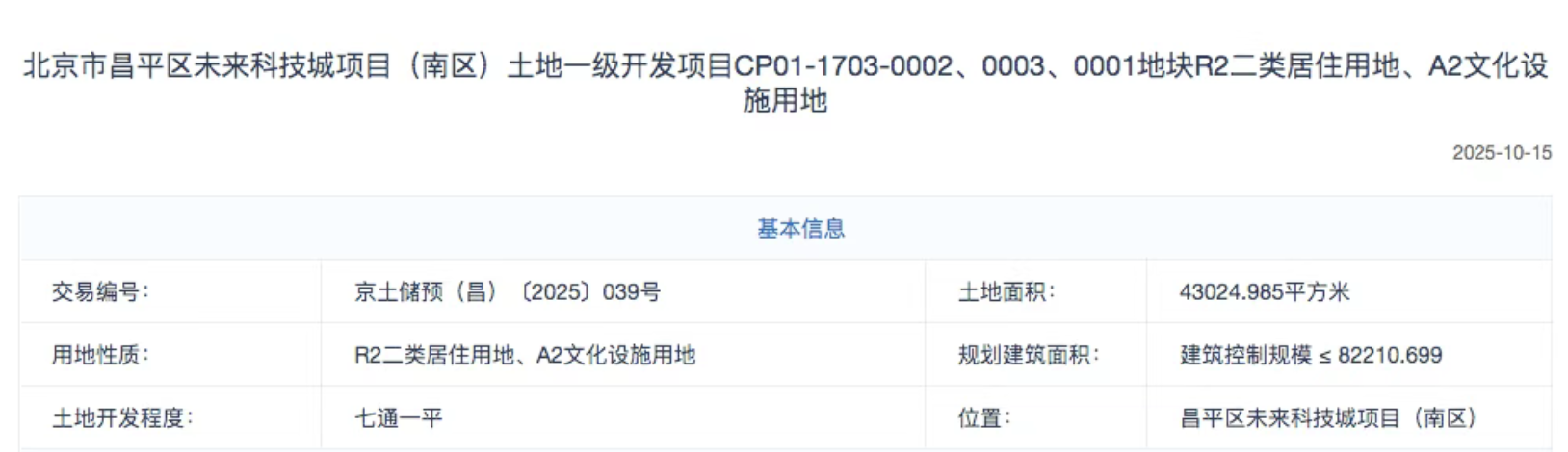 10月15日,昌平区未来科技城南区CP01-1703-0002、0003、0001地块挂牌亮相,起拍价12.426亿,正式拉开入市倒计时!