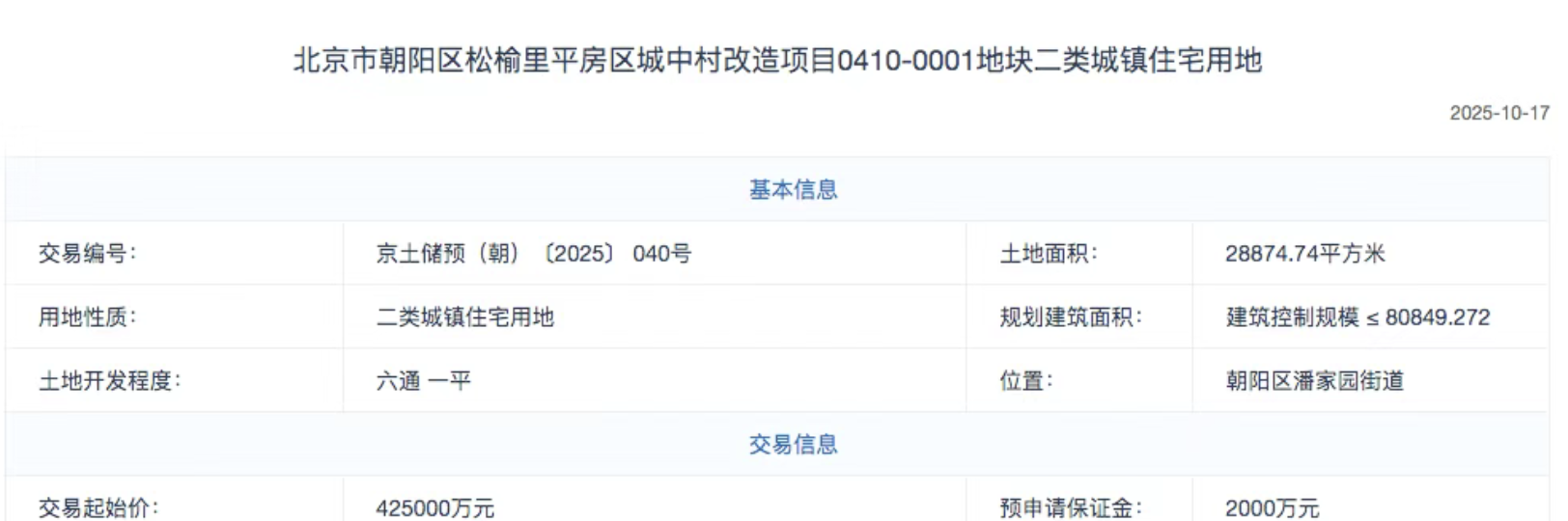 近期,北京土拍市场明显升温,朝阳区松榆里平房区改造地块正式进入预申请阶段,起拍价42.5亿元,楼面价约5.28万元/㎡。