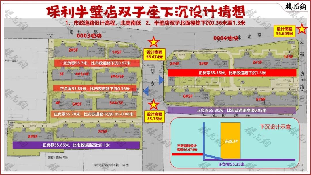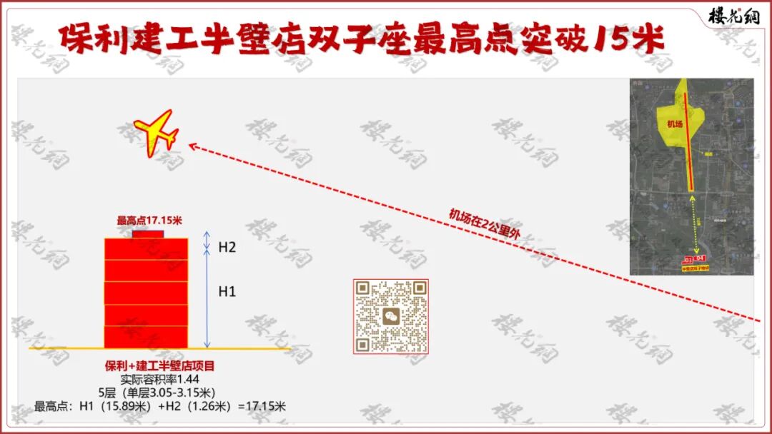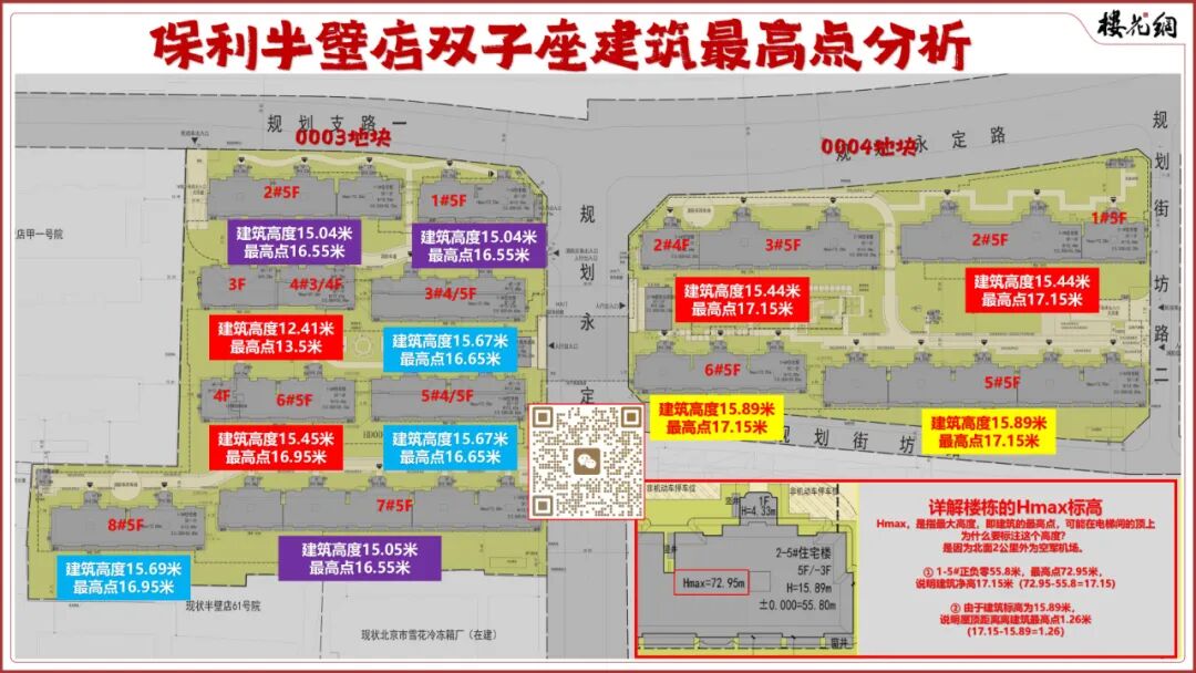 由于地块的建筑高度模糊,没有明确15米,还是18米,李红亮凭借超凡的能力,让半壁店双子突破了15米的航空高度限制,最高点达到17.15米。(详见《保利四环豪宅,神秘的下沉设计》)