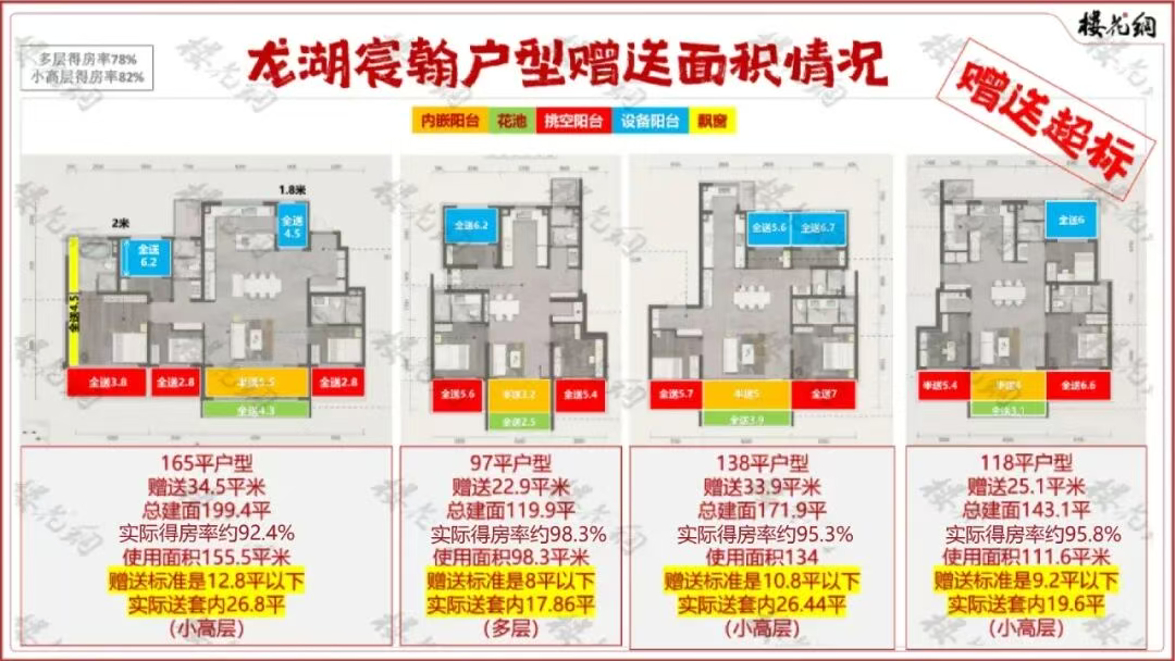 具体来看:97平在96.26%至100.32%;118平在91.95%至99.72%;138平在94.68%至96%;165平在92.21%至92.58%。