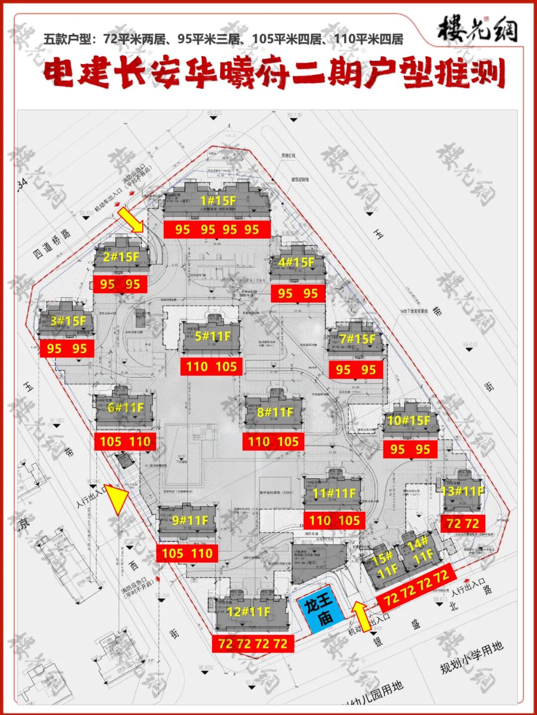 花姐推测,二期大致有四款产品:72平米两居、95平米三居、105平米和110平米四居,共计421套。