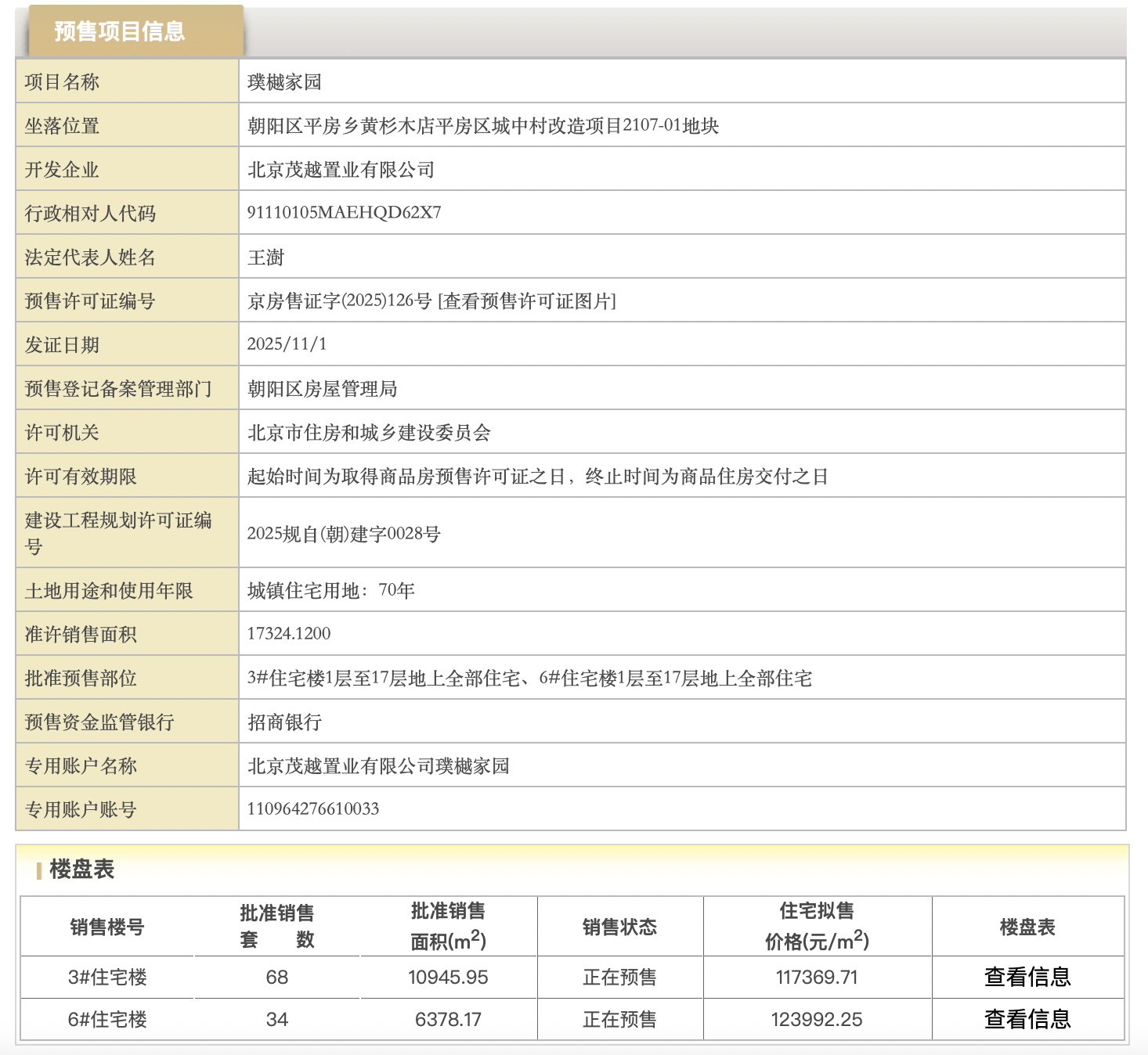 11月1日,位于朝阳区平房乡的豪宅项目“璞樾家园”第二批房源获准预售,新增批准销售面积17324.12平方米、住宅102套。