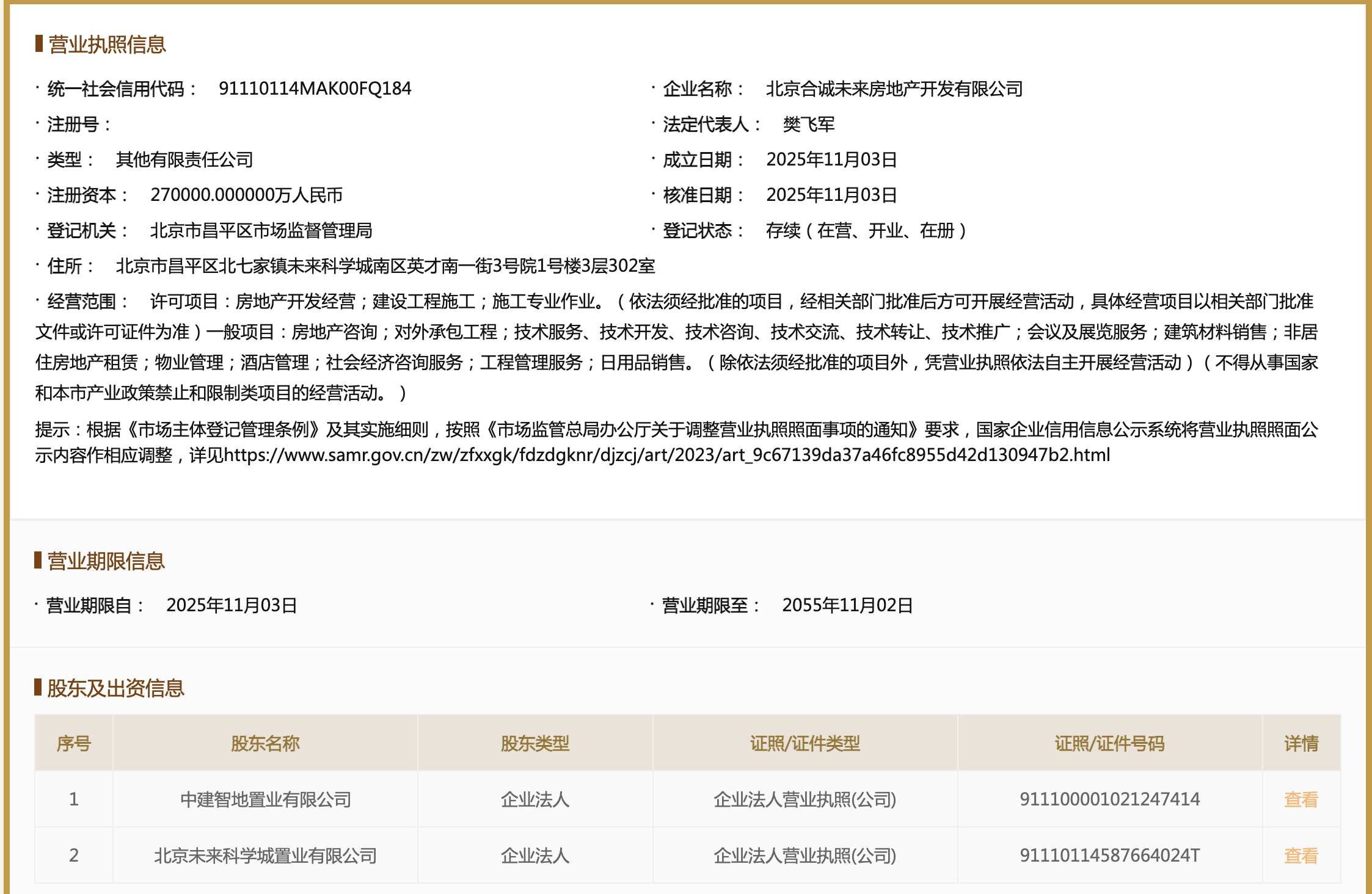 股权结构显示,中建智地持股70%,未来科学城置业持股30%,由中建一局副总经理兼中建智地董事长樊飞军出任法定代表人、董事长。