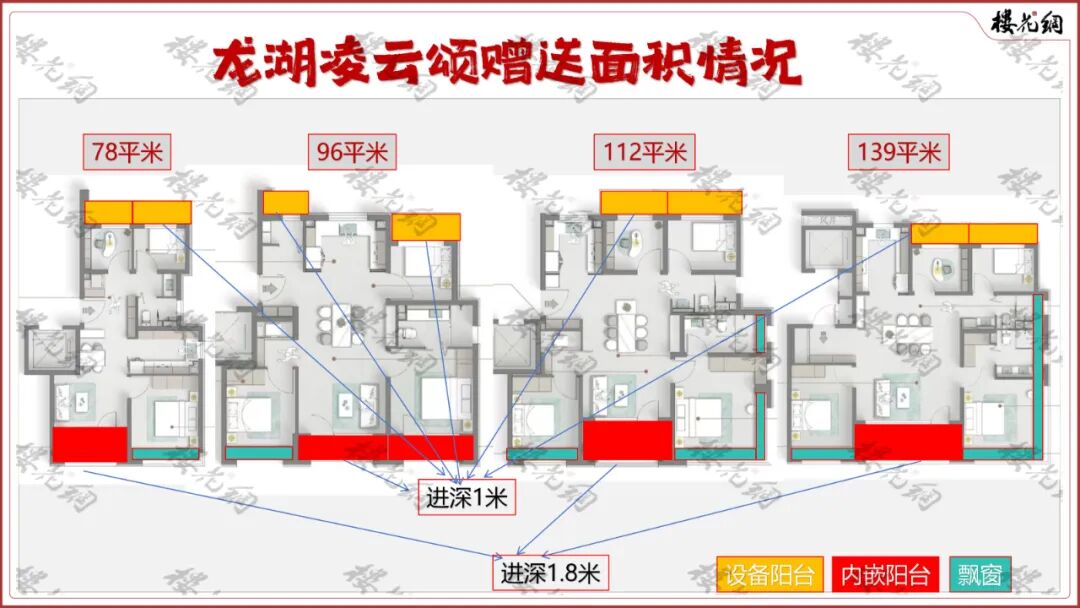 它四款户型里,78平米、112平米和139平米的南向都只有一个阳台,进深为1.8米;