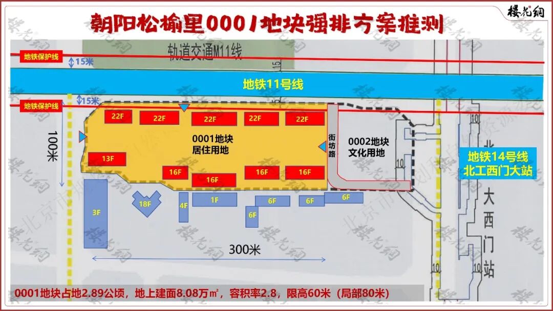 按照南北长100米计算,街坊路占了住宅地块750平米,令0410-0001地块的实际占地缩至2.815公顷,加上北面退线地铁11号线约7.5米——在地铁保护线内,花姐预计松榆里地块的实际容积率达到3.0。