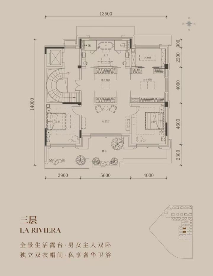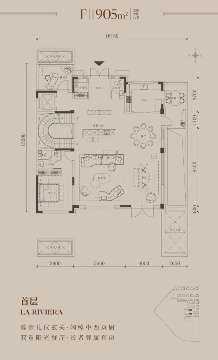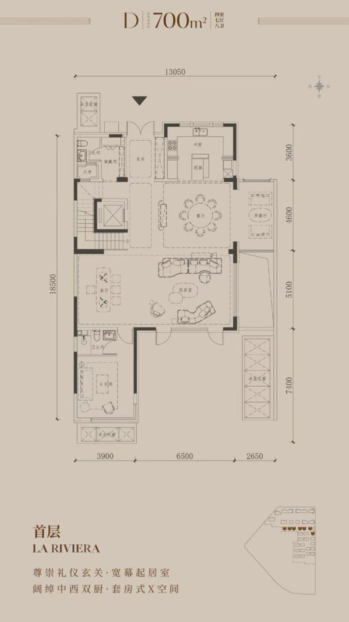 其中,主力产品为建面约700至990平方米的院墅。990平方米主力户型主打“四代同堂”居住理念,采用分层功能设计: