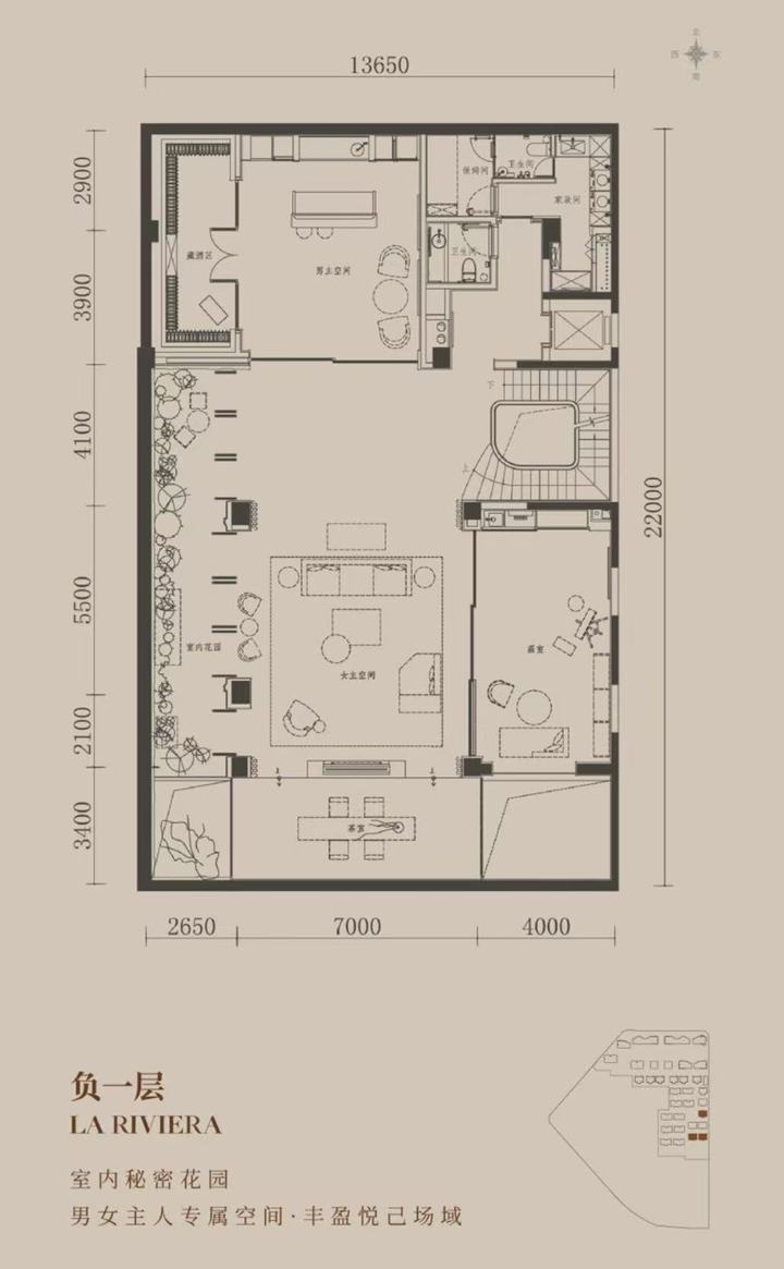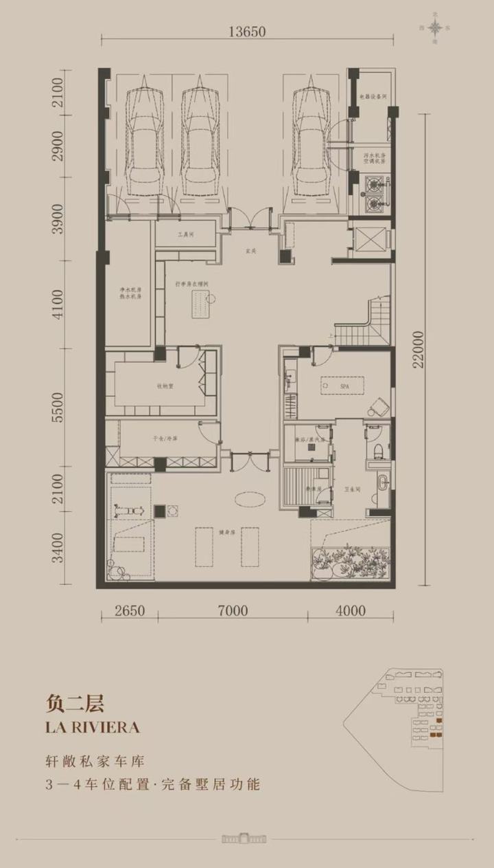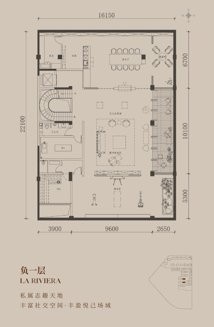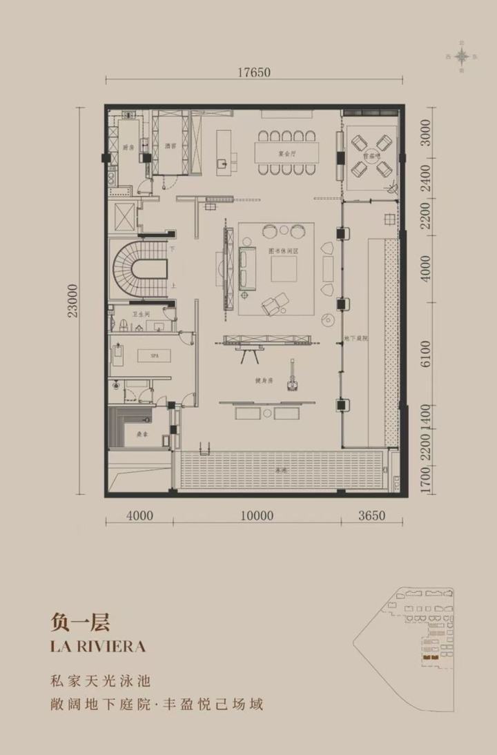地下空间设计为会所式功能区,包含天光泳池、桑拿房、健身房及休闲社交区。