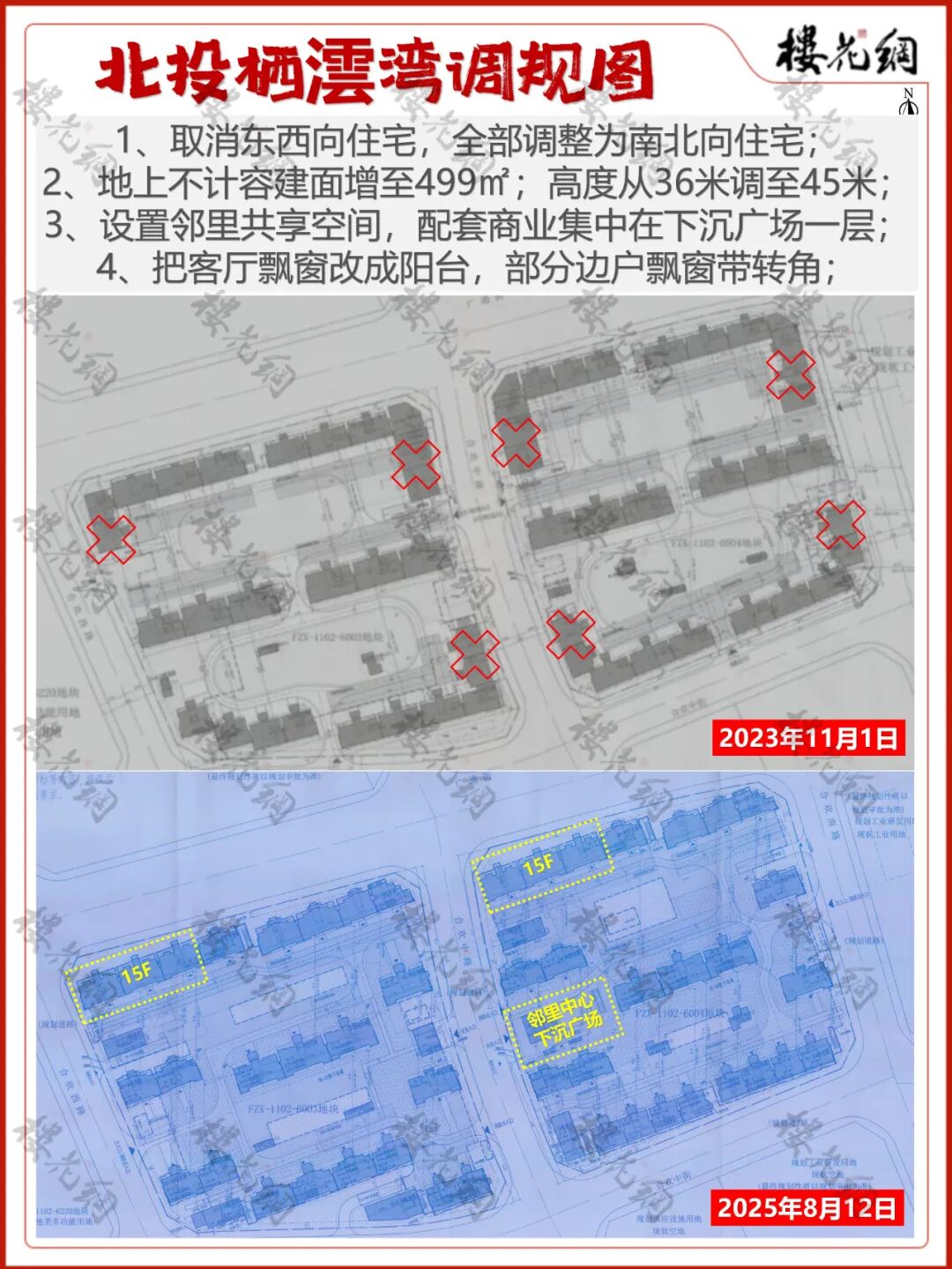 2、地上不计容建面增至499㎡;高度从36米调至45米——两地块2#的西边三单元为15F,其余都是11F及以下洋房产品;