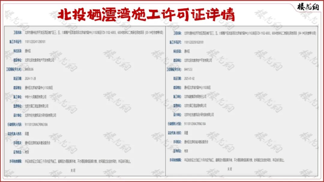 这两张施工证的证号分别为西地块110112202411280101和东地块110112202501020101,工程规模为8.66万平米和8.44万平米。