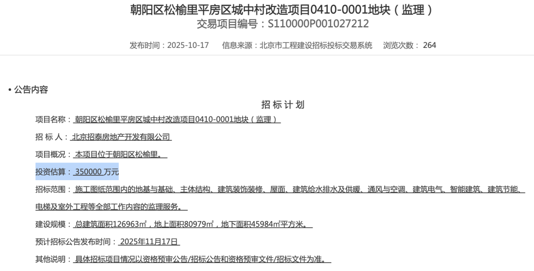 此前10月17日,北京市公共资源交易服务平台发布了该地块的施工和监理招标计划。