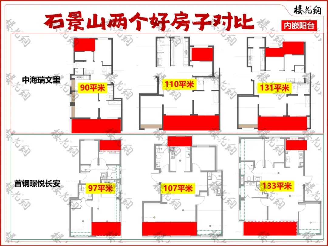 2、首钢璟悦长安97平南向内嵌阳台只有客厅一处,主卧为飘窗;中海瑞文里90平,客厅主卧均为内嵌阳台。