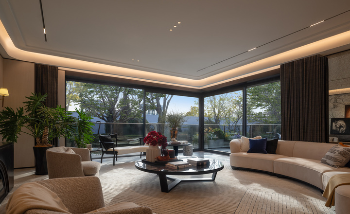 转角门向两侧徐徐拉开,客厅一角随之融入到温榆河公园当中,室内室外边界,就此消融。