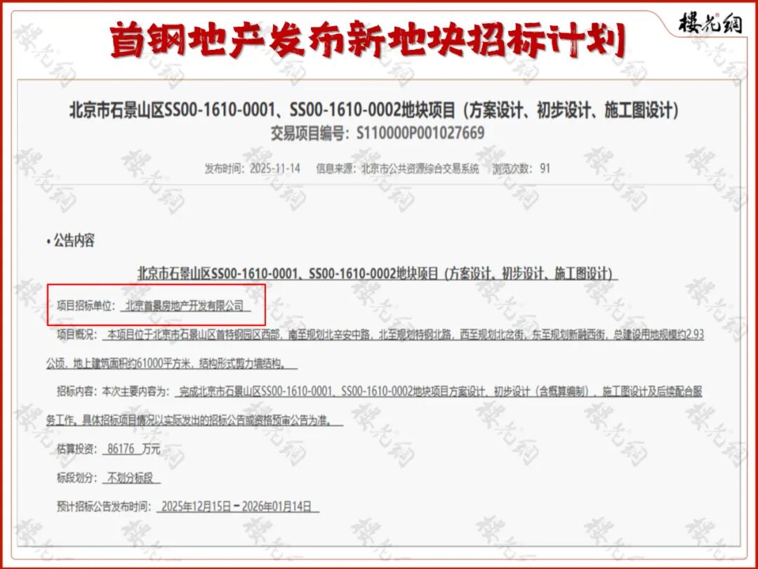 按照首钢地产的预计招标公告发布时间推算,这宗地的土拍时间可能在2026年1月中旬。