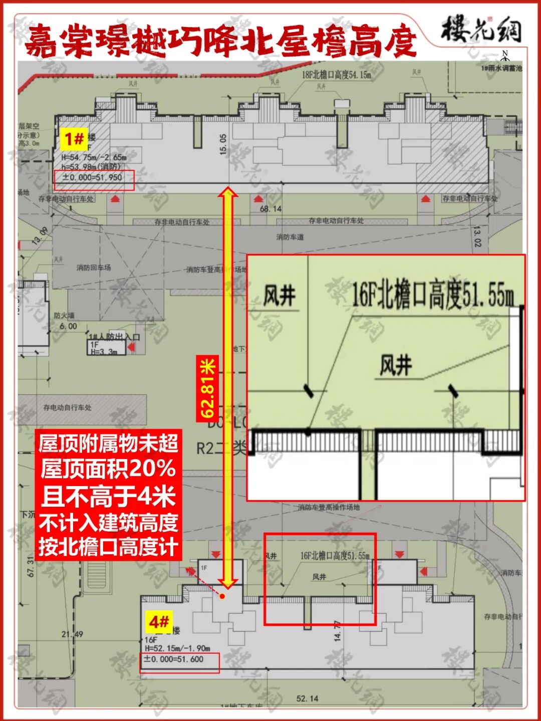 拿4#楼举例,它的建筑高度为52.15米,北侧通过设计处理,檐口高度51.55米。经过复核,日照间距都满足设计规范。