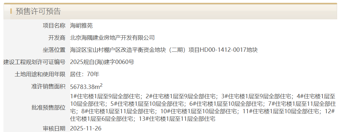 11月26日,北京隅海岄发布取证预告,备案名为“海岄雅苑”。