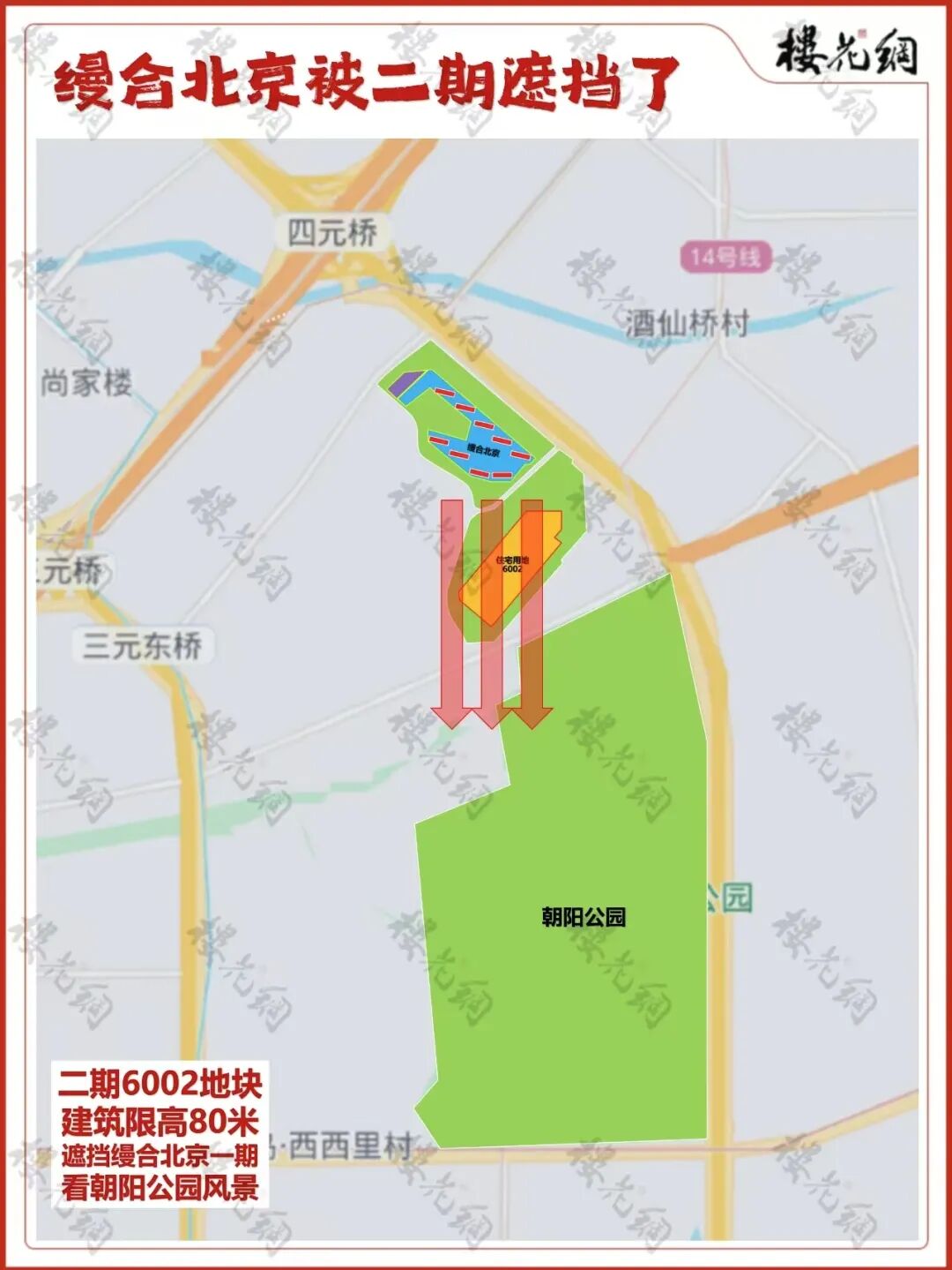 雪上加霜的是,缦合北京2#未来还将遇到一个问题,被二期房子挡住看朝阳公园的视线。