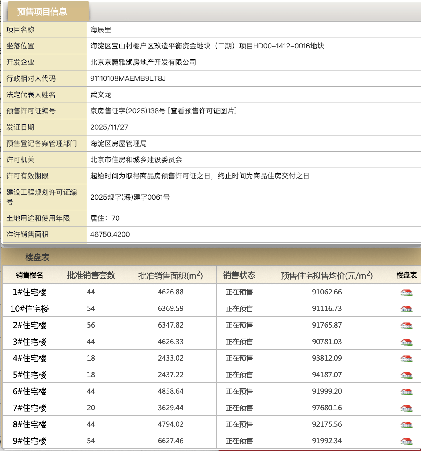 11月27日,中建壹品海淀宝山新盘海宸元境取得预售许可证。