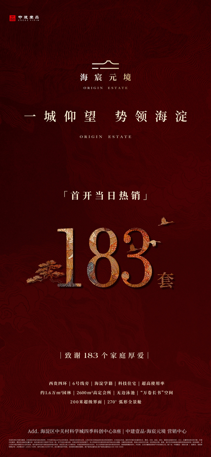 作为北京楼市今年第四季度最受关注的项目之一,中建壹品·海宸元境从拿地、设计到开盘,每一步都引发市场和客户的高度关注。项目入市以海淀稀缺99㎡户型、全媒体声量、渠道生态共建计划组合拳实现近万人大客储。据了解,海宸元境首开价格充分尊重市场,给到客户满满诚意。项目的开盘热销,也是产品力的成功,更清晰地印证了当前市场对高品质、强产品力住宅的迫切需求与高度认可。