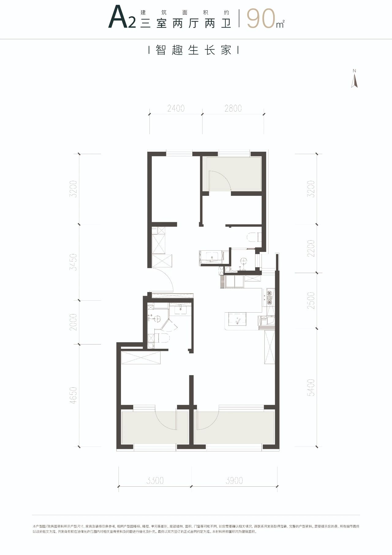 90㎡三居两卫中间户赠送约9㎡,边户赠送约12㎡;