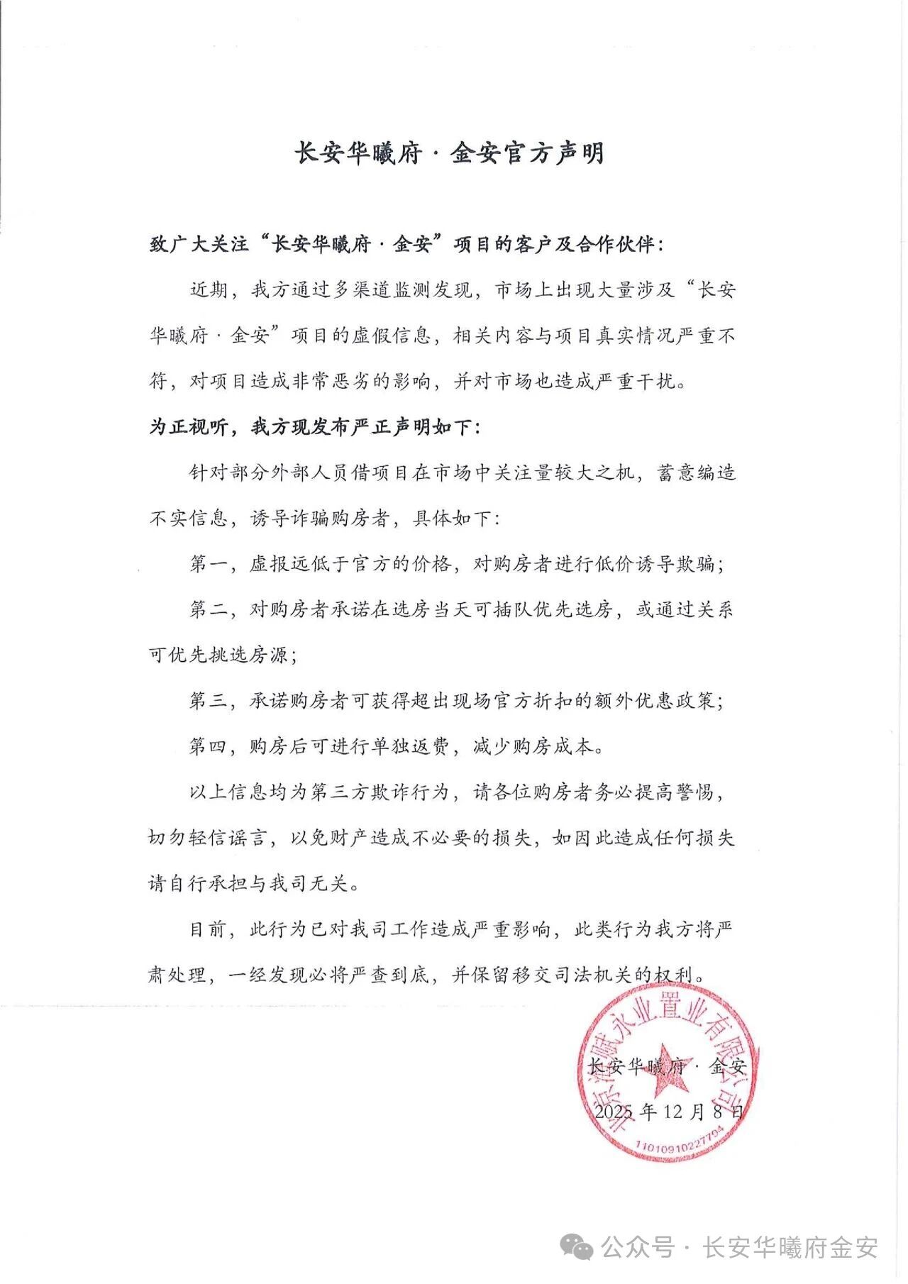 12月8日晚间,电建门头沟新盘长安华曦府·金安官方声明称,通过多渠道监测发现,市场上出现大量涉及“长安华曦府·金安”项目的虚假信息。