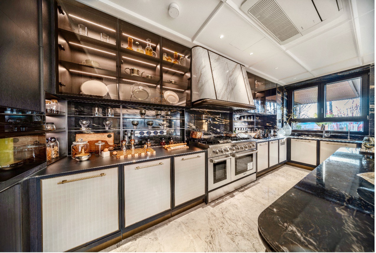 懋源深知“品质在于细节”,平墅样样板间的细节处尽显奢侈质感。骊橒臺倡导“回归家庭,参与生活”理念,搭载米其林专业级餐厨系统雷神6眼灶具与AEG嵌入式家电,将烹饪与社交的乐趣无限放大;样板间预留高端衣物料理系统空间,享誉北欧的ASKO雅士高衣物护理机实现衣物护理、除菌、塑形一体化智能管理,诠释顶流圈层的精致穿衣生活;烟雨江南大理石、影木木饰面等材质的运用,营造出艺术馆级的空间质感,于细节处彰显定制匠心。