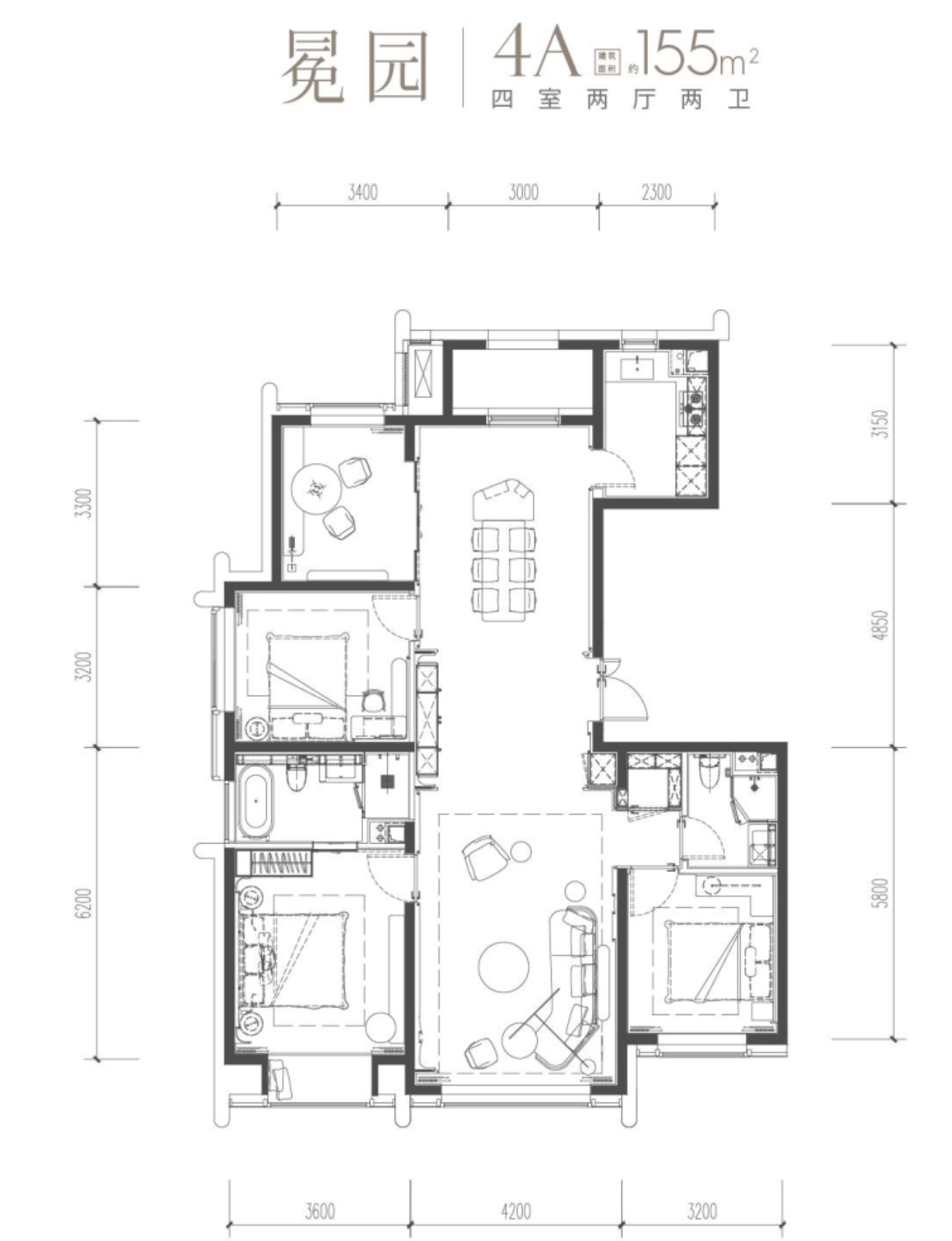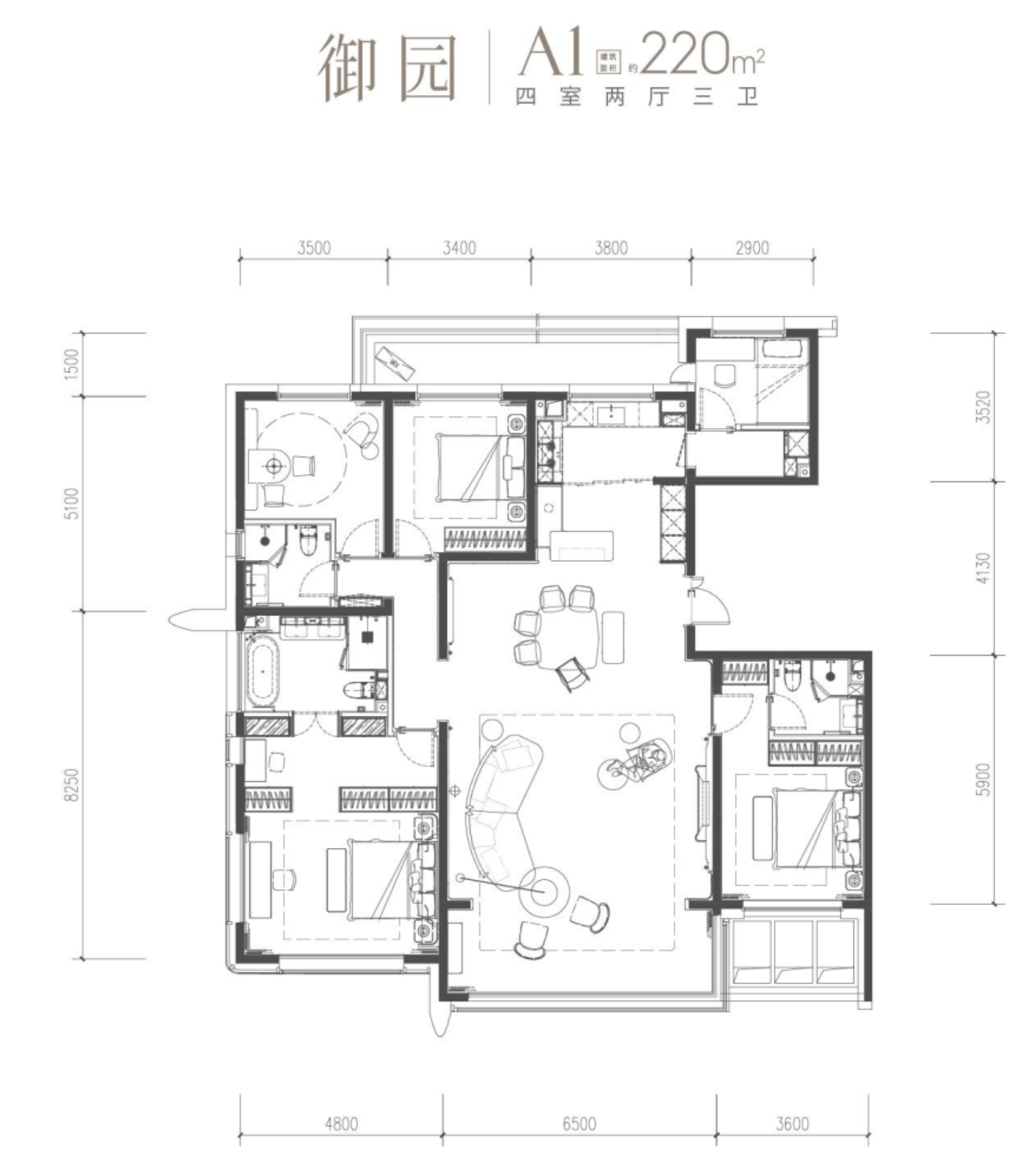 顶配220户型,动静分区的格局,客厅面宽给到6.5米。