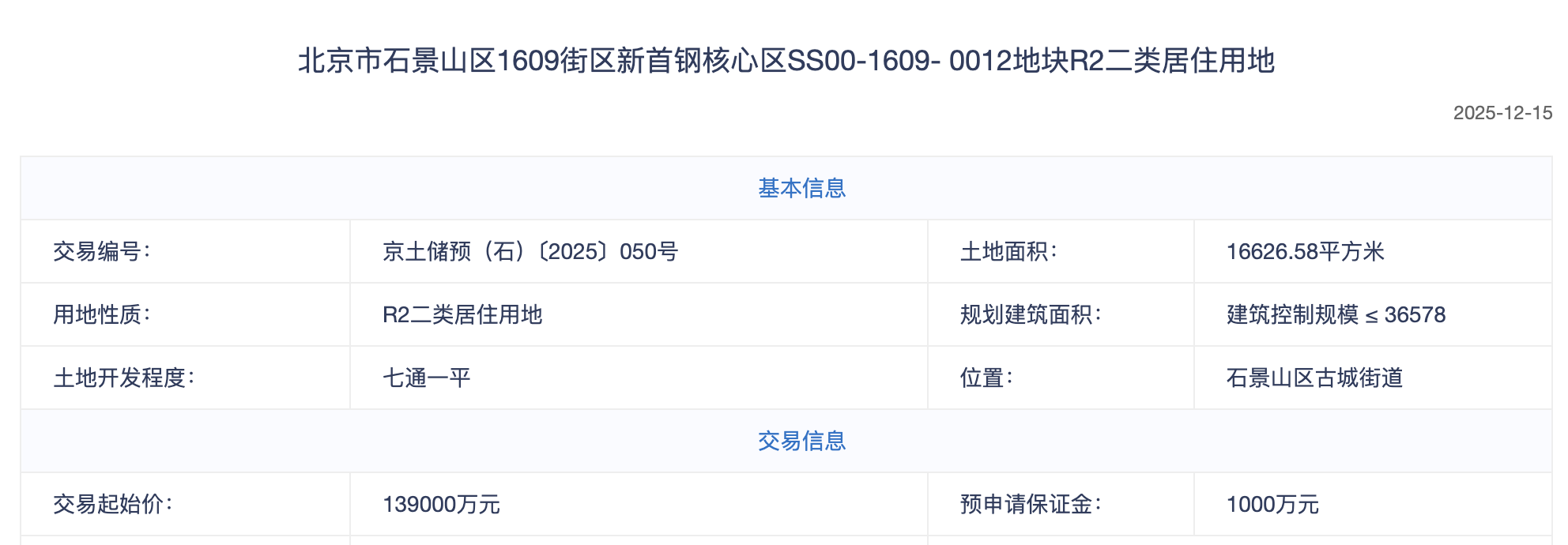 12月15日,石景山区1609街区新首钢核心区SS00-1609-0012地块进入用地预申请。