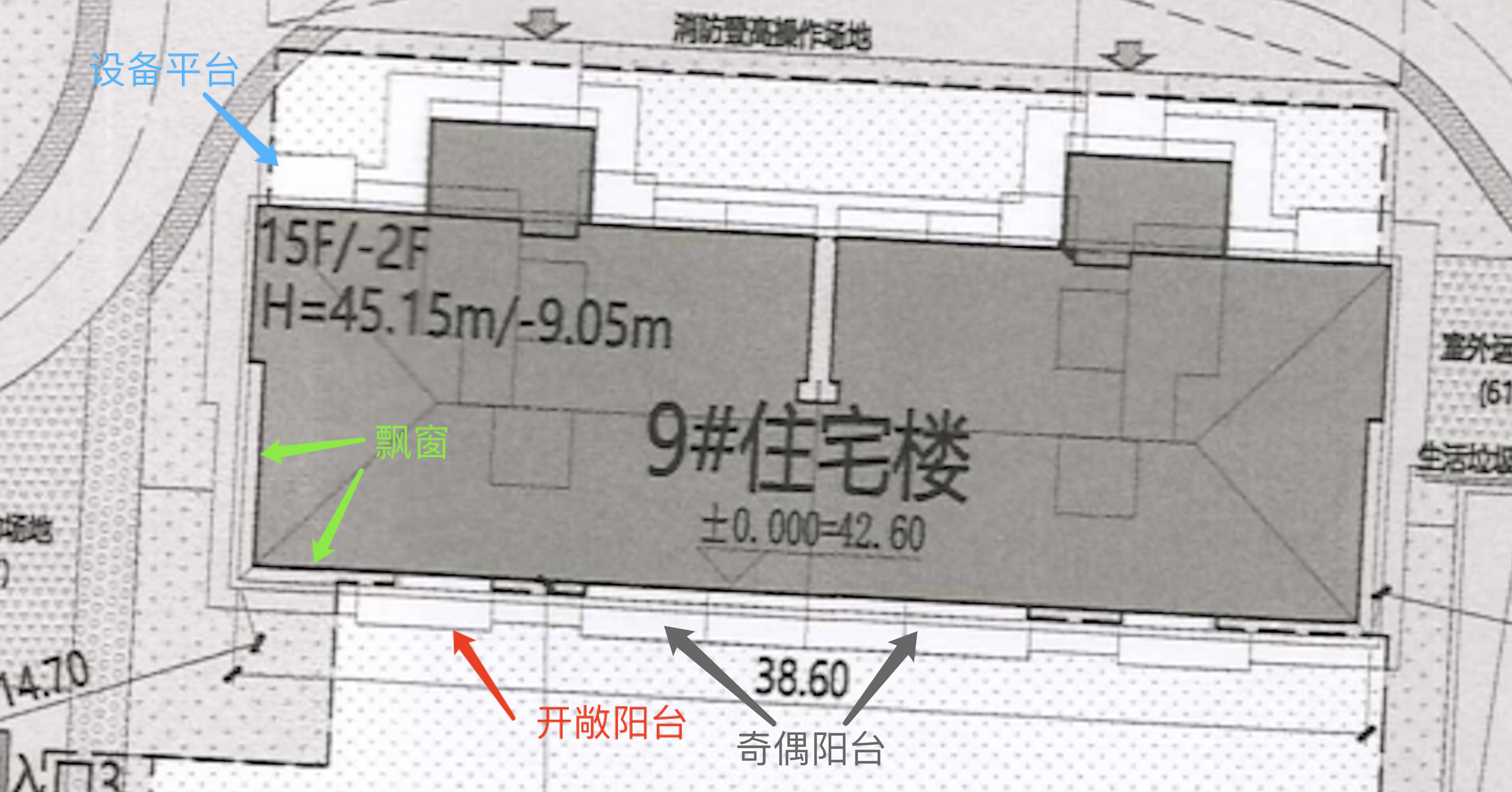 奇偶阳台+设备平台,边户有大尺度转角飘窗。