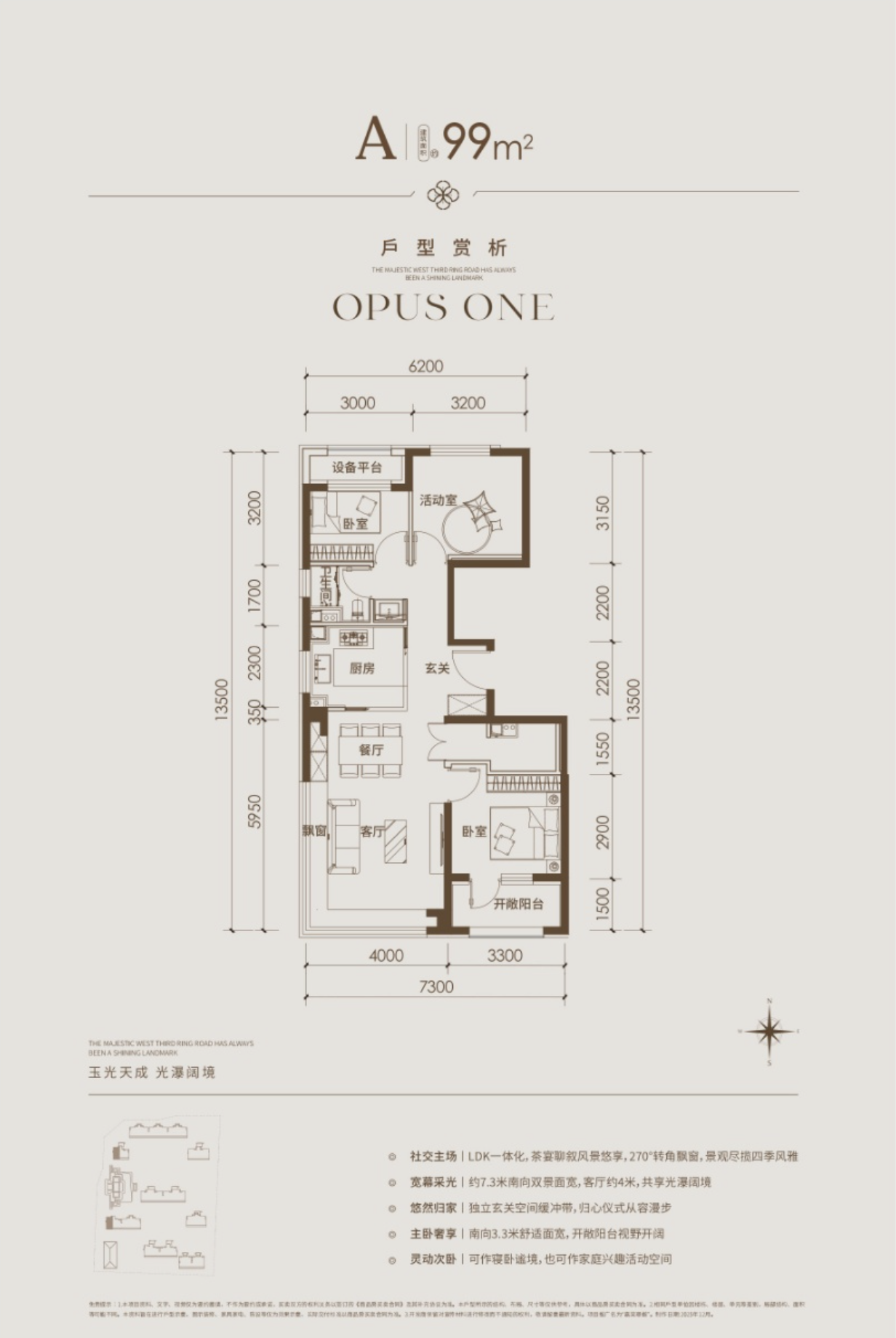 起步建面99㎡户型,南向两面宽,只有卧室是阳台,客厅送大尺度转角飘窗;