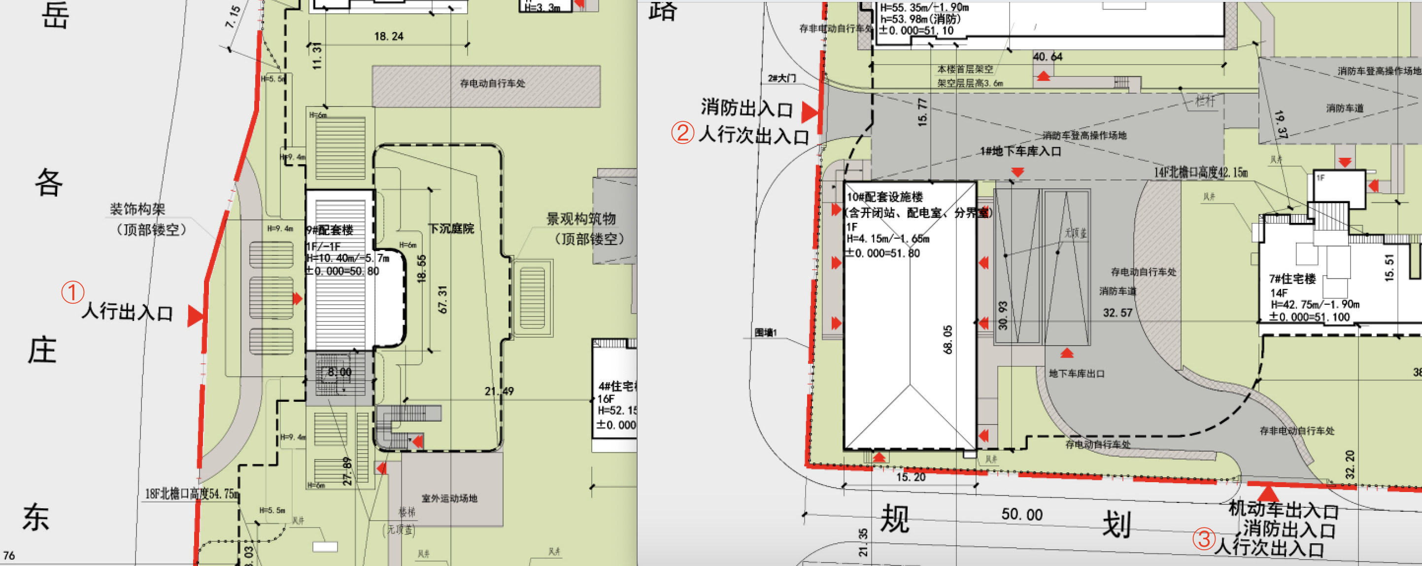 两处车行出入口,北口与人行、消防共用,另一处在偏西南角的位置。