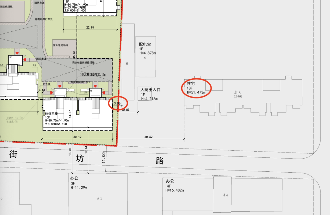 嘉棠璟樾的总平图上,只有东南角10#楼洋房标注了与东侧红线(围墙)的退线距离是3.96米,其余都没有标记退线数值。