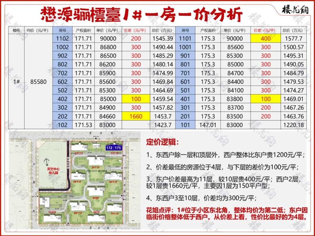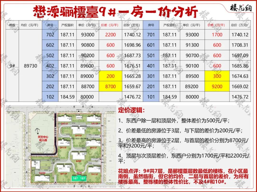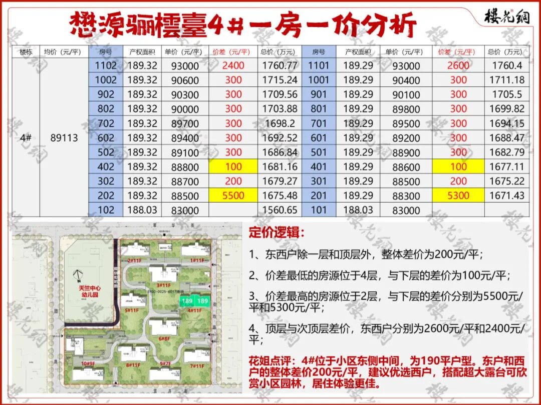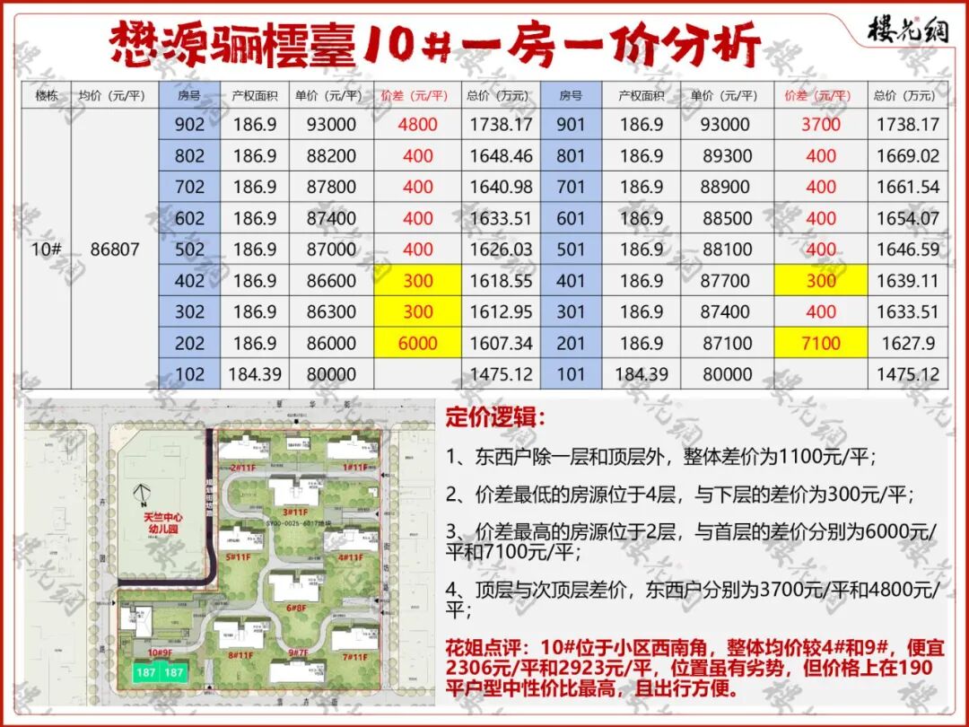选房攻略:在190平段位中,10#整体均价较4#和9#,分别便宜2306元/平和2923元/平。