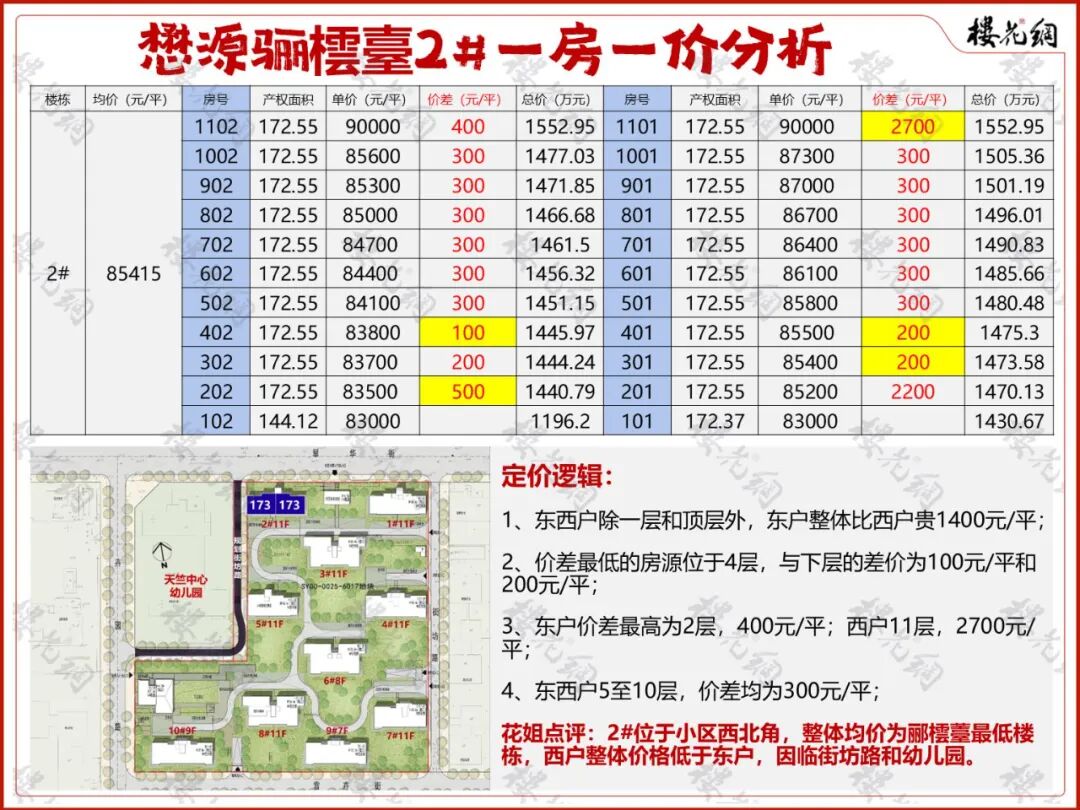 选房攻略:2#整体均价,为郦橒薹最低楼栋,因临街坊路和幼儿园,西户整体价格低于东户。从价差上看,最具性价比的户型,除了4层外,在西户1102室,预售价只比下层,多了400元/平。
