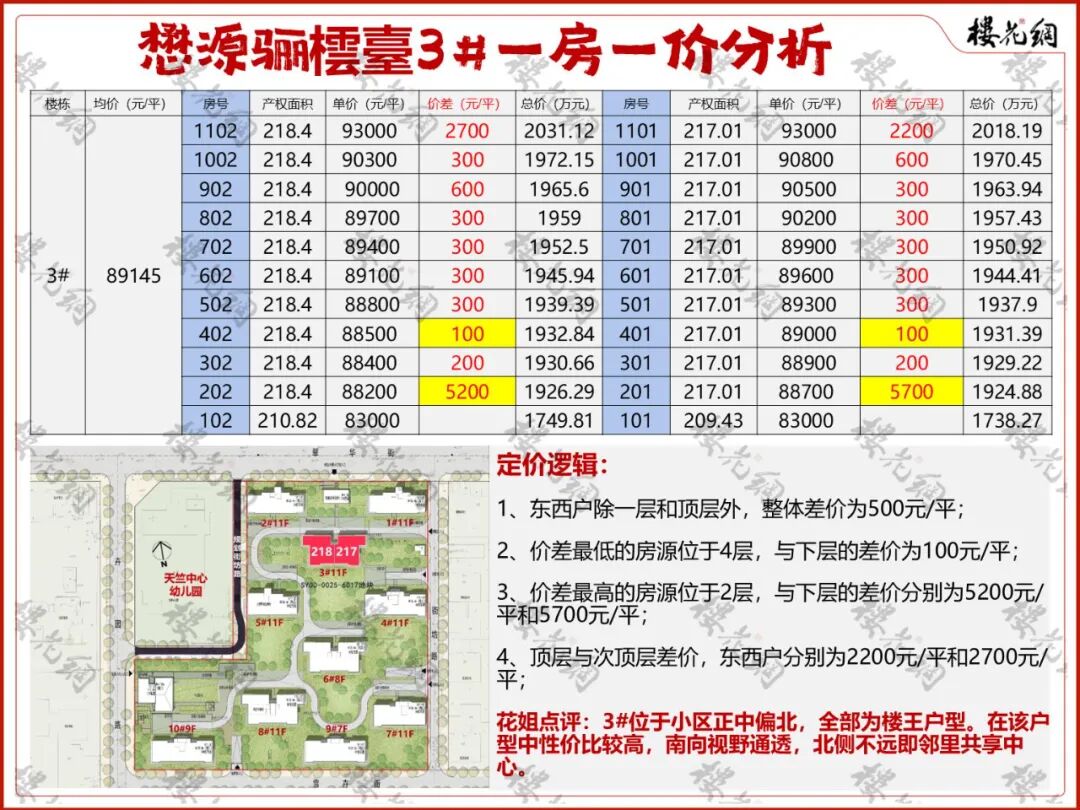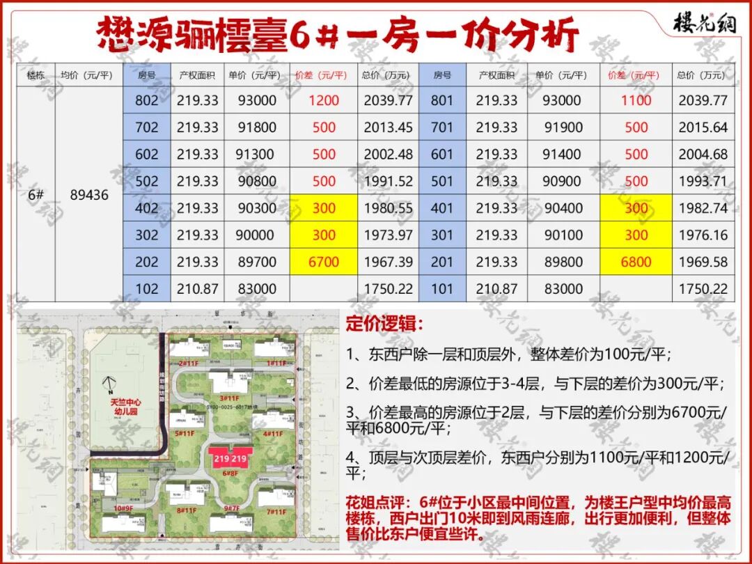位于小区正中稍偏南一点,为真正的楼王;东西户型均为219平;整体预售均价8.94万元/平米。
