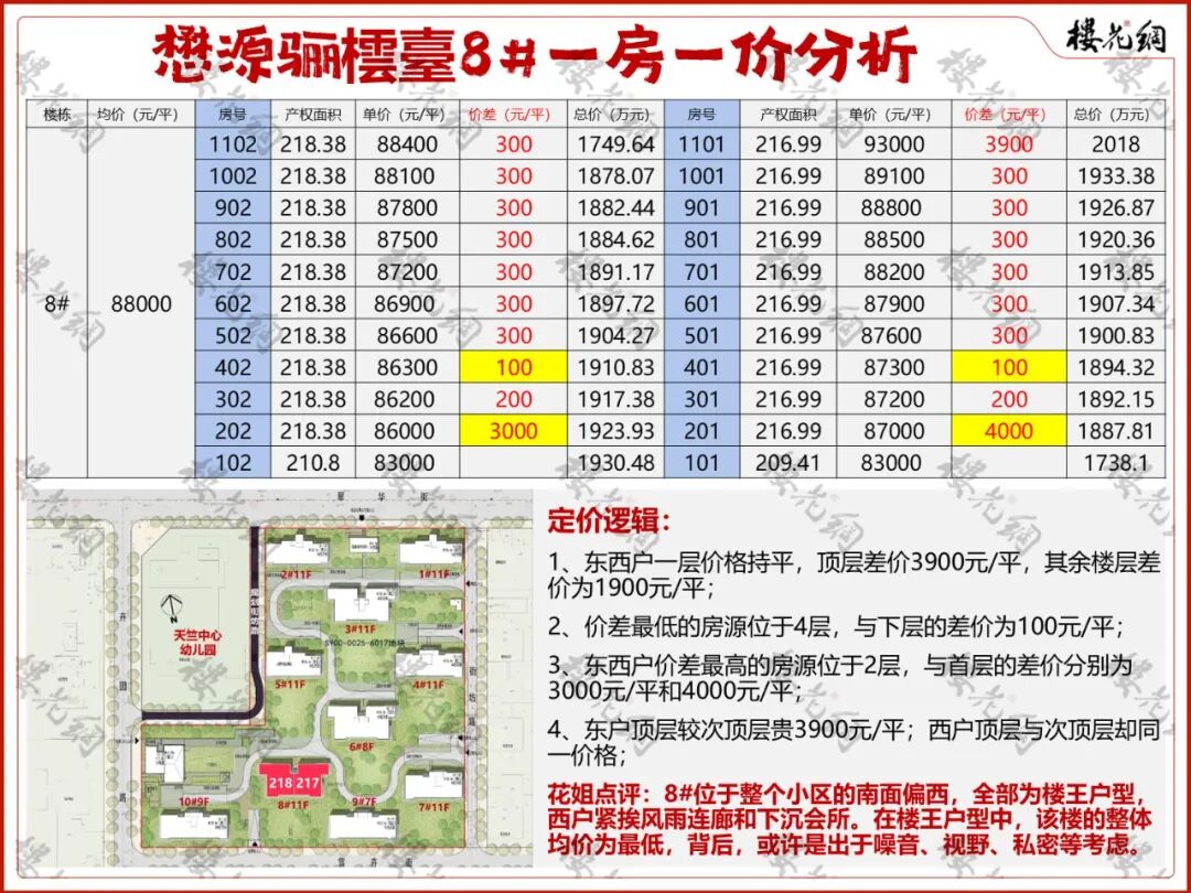 位于小区南面中间偏西,为楼王户型,东户217平、西户218平;整体预售均价为8.8万元/平米。