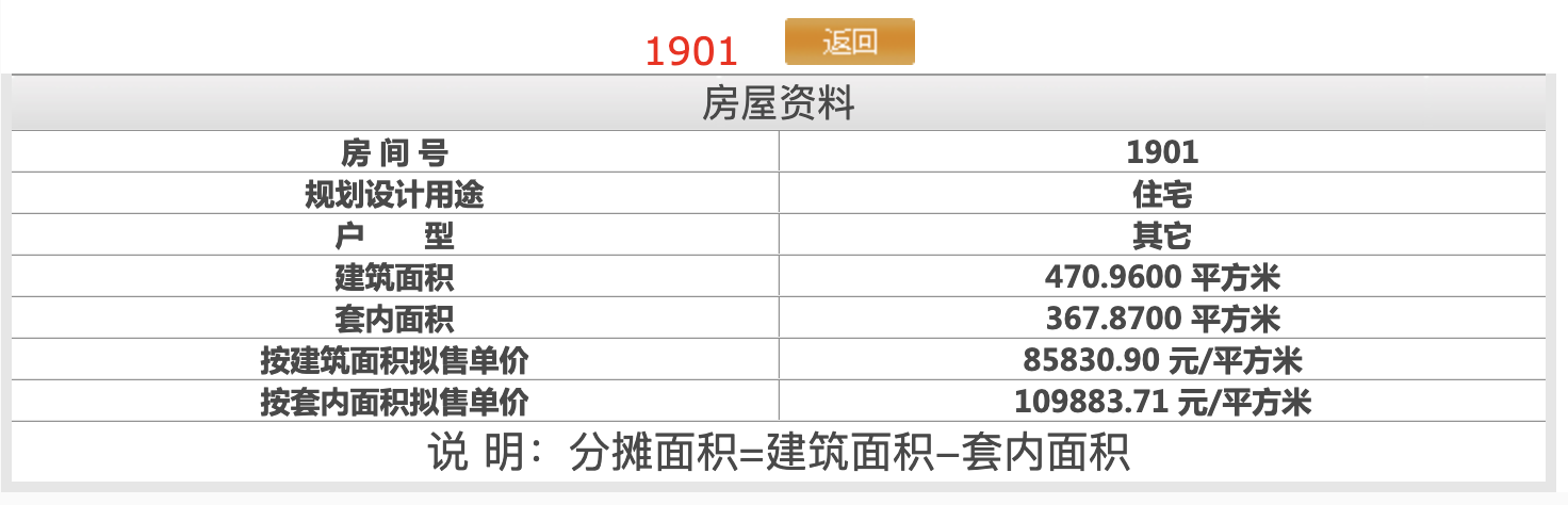 4#楼顶层,1901,建面470.96㎡,总价4042.29万元。