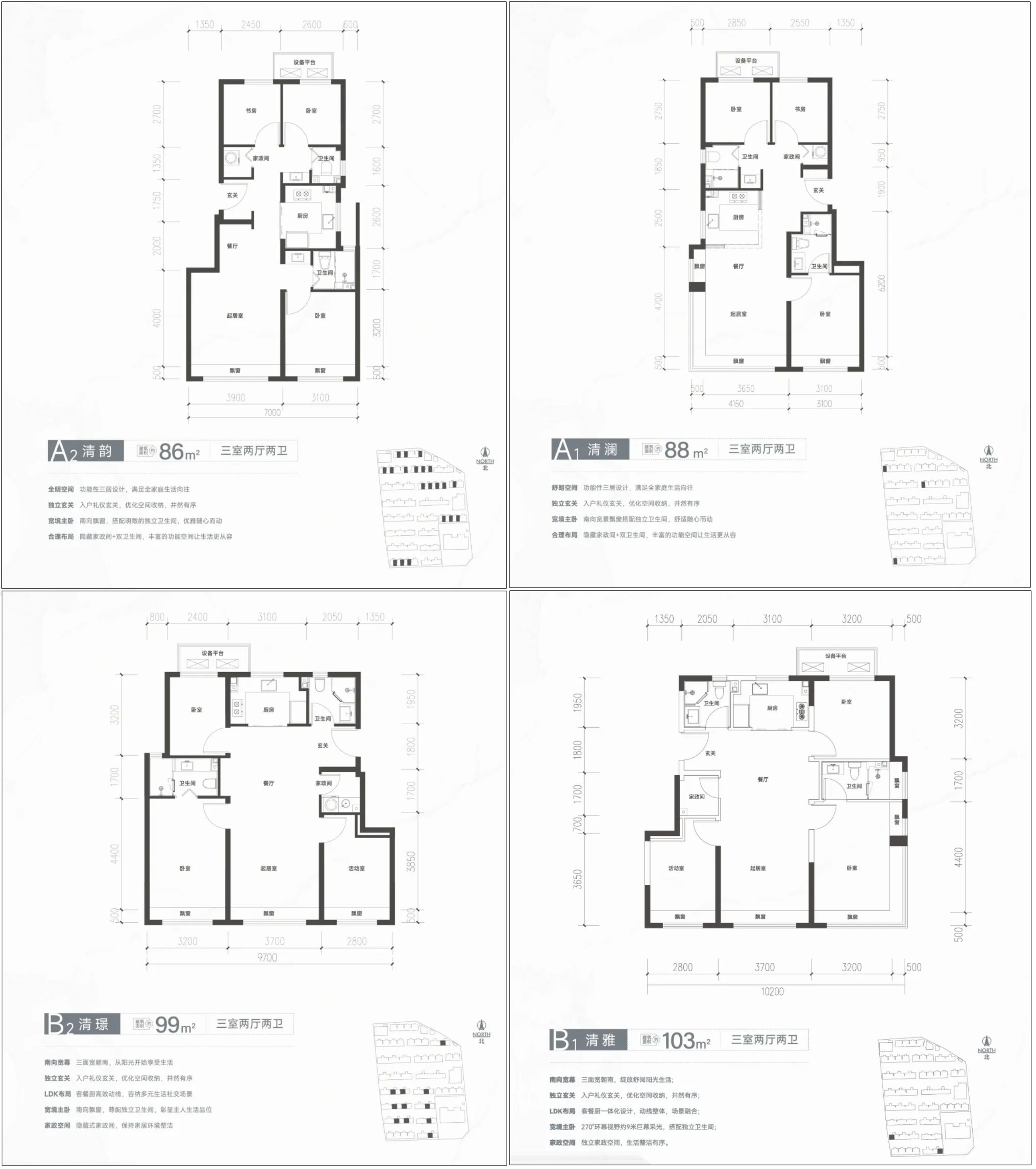 一、二期产品户型相同,均为建面86-143㎡三居四居,层高3米+。