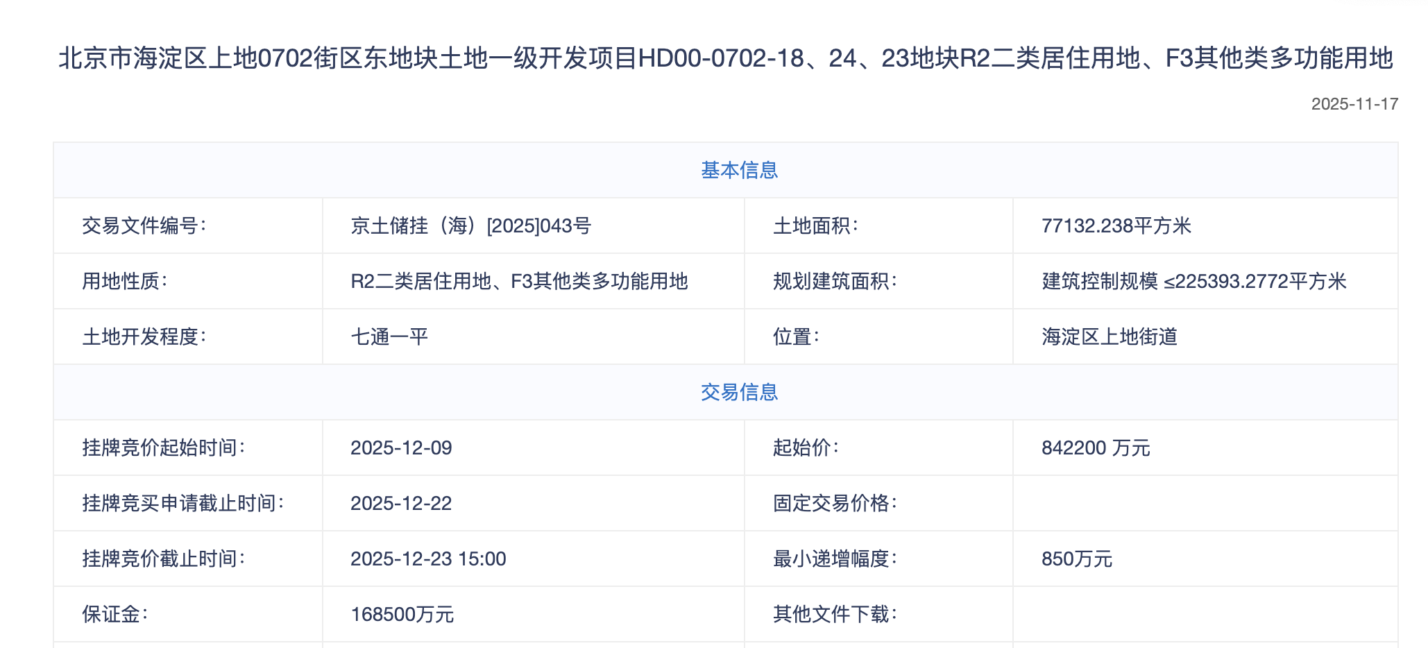 12月23日,海淀上地0702街区地块完成出让,受让方为海开控股。