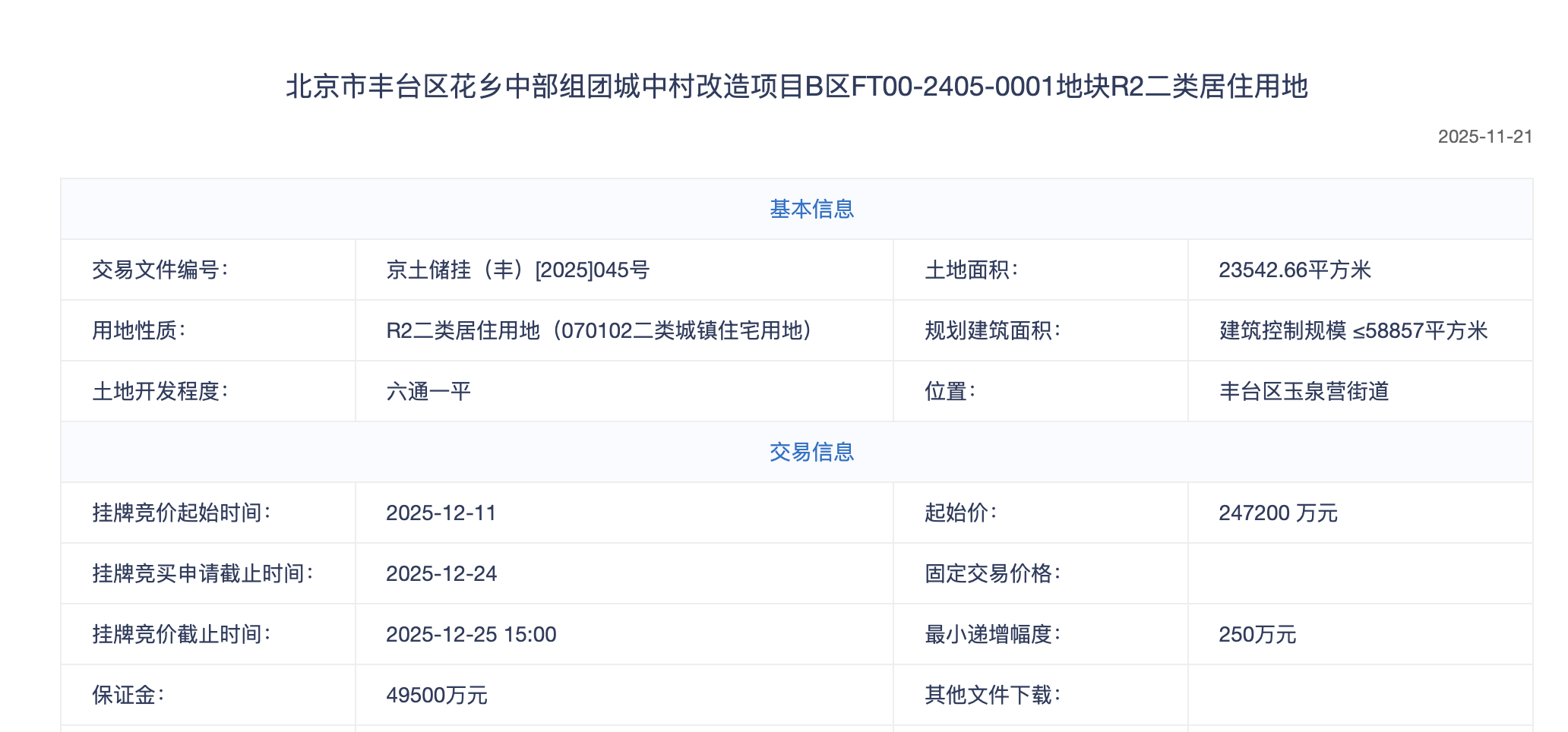 12月24日,花乡中部组团2405-0001地块,线上无人出价。