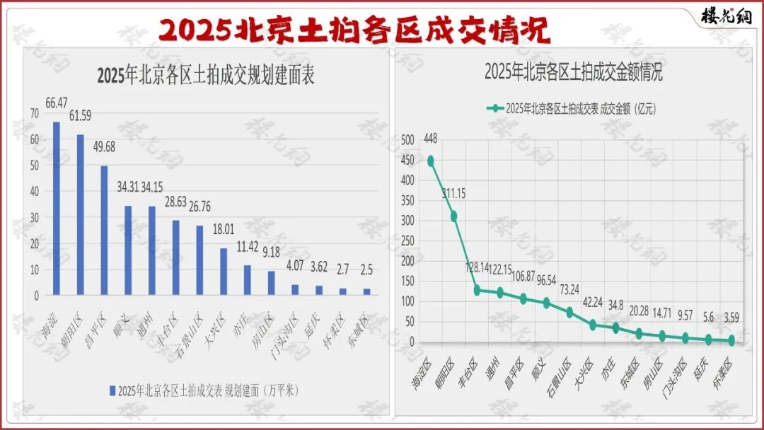 2025年,海淀土地成交金额448亿元、建面66.47万平;朝阳土地成交311.15亿元,建面61.59万平米。