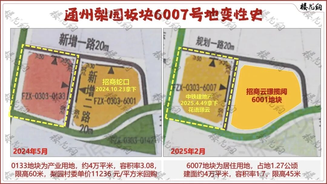 2025年4月29日,中铁建地产以7.755亿元,摘得通州梨园6007地块,楼面价3.58万元/㎡,溢价率21.94%,创造通州楼市的多个土拍纪录。