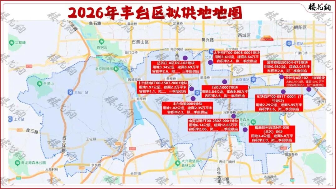 2026年,丰台预计供地10宗地,规划建面约70万平米。其中,二三环之间有3宗,三四环之间有5宗。