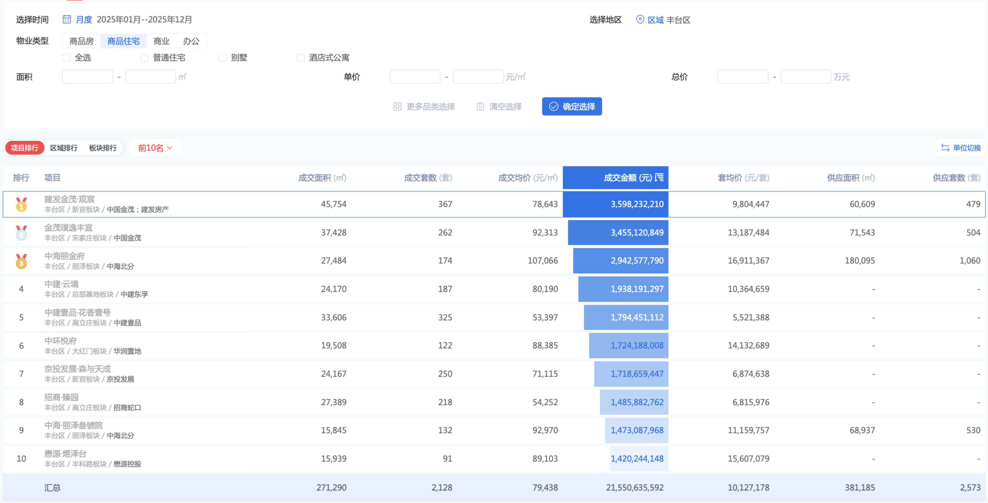 根据丰台区2025年度商品房网签金额排行榜显示,建发金茂观宸(一期),以35.98亿元的成绩位列丰台区网签榜第一。